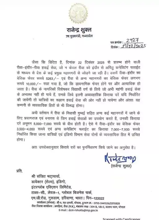 रीवा-इंदौर-रीवा हवाई सेवा को लेकर किराए का मुद्दा अब सियासी और जनहित का विषय बन गया है। 22 दिसंबर 2025 से शुरू होने जा रही इस फ्लाइट के किराए पर उपमुख्यमंत्री राजेंद्र शुक्ला ने आपत्ति जताई है। उन्होंने विमानन कंपनी इंडिगो को पत्र लिखकर साफ कहा है कि मौजूदा किराया आम यात्रियों, खासकर विद्यार्थियों और मध्यम वर्ग के लिए बिल्कुल अव्यवहारिक है।