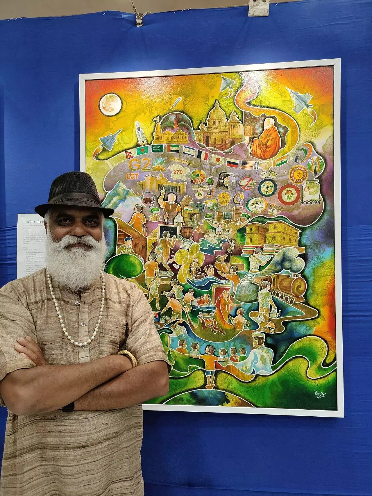 मुख्य फोटो में कलाकार विवेक की तस्वीर प्रधानमंत्री मोदी की पेंटिंग के साथ नजर आई, जो उनकी कला की गहराई को दर्शाती है।
