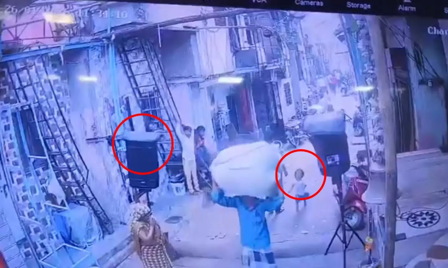 सीसीटीवी फुटेज में साफ देखा जा सकता है कि एक व्यक्ति सिर पर कालीन (दरी) उठाकर सड़क से गुजर रहा था। उसके पीछे ही तीन साल की बच्ची खेलते हुए चल रही थी। इसी दौरान दरी लाउडस्पीकर के तार में उलझ गई, जिससे संतुलन बिगड़ा और भारी स्पीकर सीधे बच्ची पर गिर पड़ा।