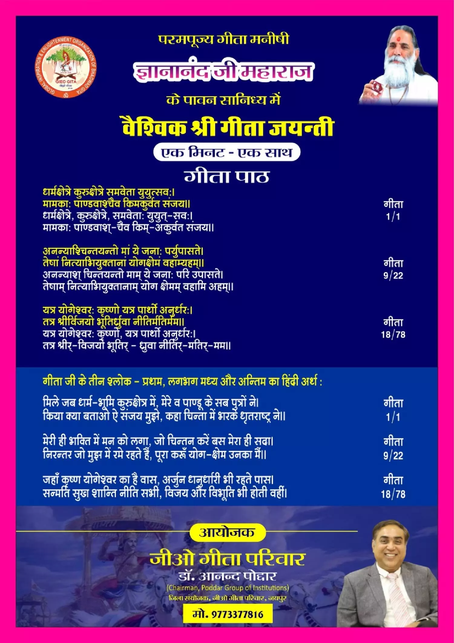 गीता परिवार जयपुर के अध्यक्ष डॉ. आनंद पोद्दार ने बताया कि गीता जयंती के अवसर पर पूरे सप्ताह आध्यात्मिक, शैक्षणिक और जनजागरण कार्यक्रम आयोजित किए जा रहे हैं, ताकि समाज में गीता के आदर्शों को व्यापक रूप से पहुंचाया जा सके।