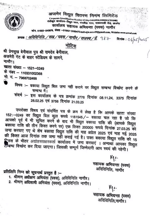 जानकारी के अनुसार, 8 नवंबर 2024 को अजमेर विद्युत वितरण निगम लिमिटेड (AVVNL) के नागौर कार्यालय से दो अलग-अलग नोटिस जारी किए गए थे। पहला नोटिस प्रेमसुख बेनीवाल के नाम था, जिसमें करीब ₹9.82 लाख की बकाया राशि का उल्लेख किया गया था। इसी नोटिस पर पेन से नागौर सांसद हनुमान बेनीवाल का नाम भी अलग से लिखा गया था।