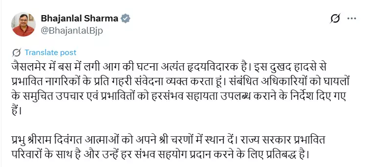 प्रशासन ने हादसे की गहन जांच शुरू कर दी है। बस मालिक और चालक के खिलाफ एफआईआर दर्ज की गई है। मुख्यमंत्री भजनलाल शर्मा ने ट्वीट कर शोक व्यक्त किया और अधिकारियों को तत्काल राहत पहुंचाने के निर्देश दिए। सूत्रों के अनुसार, सीएम कुछ ही देर में जैसलमेर पहुंचेंगे, घटनास्थल का निरीक्षण करेंगे और फिर जोधपुर जाकर घायलों से मुलाकात करेंगे। उनके साथ स्वास्थ्य मंत्री गजेंद्र सिंह शेखावत और एसीएस शिखर अग्रवाल भी हैं।