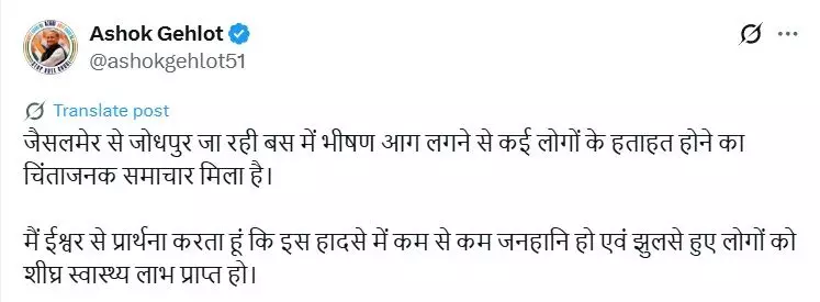 पूर्व सीएम अशोक गहलोत ने भी दुख जताते हुए कहा, "यह दर्दनाक हादसा है, भगवान मृतकों को शांति दें।"