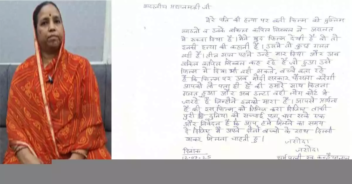 कन्हैयालाल की पत्नी जशोदा ने पत्र में लिखा कि मौलाना मदनी और कपिल सिब्बल ने अदालत में फिल्म की रिलीज रोक दी, जबकि उन्होंने स्वयं फिल्म देखी है और मानती हैं कि इसमें कुछ भी गलत नहीं है। उन्होंने साफ कहा कि तीन साल पहले हुई उनकी हत्या की कहानी बताना गलत नहीं, और फिर भी इसे दिखाने की अनुमति नहीं दी जा रही। साथ ही जशोदा ने लिखा कि उनके बच्चे कह रहे हैं कि अब मोदी सरकार ही इस पर फैसला करेगी।