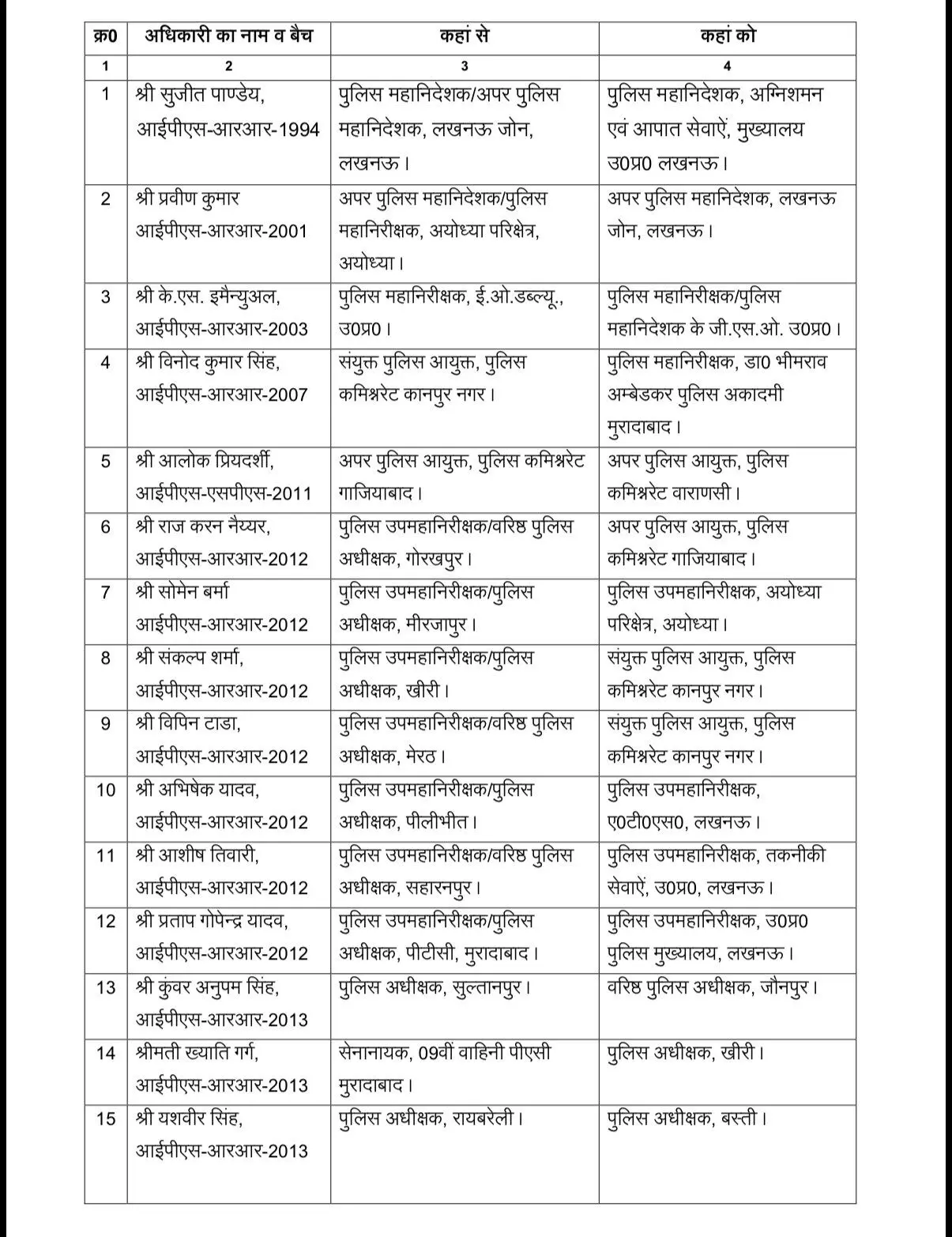 तबादलों की इस सूची में सबसे महत्वपूर्ण नाम सुजीत पाण्डेय का है, जिन्हें डीजी, अग्निशमन एवं आपात सेवाएं बनाया गया है। वहीं, तेज-तर्रार अधिकारी प्रवीन कुमार को लखनऊ जोन का एडीजी नियुक्त किया गया है।