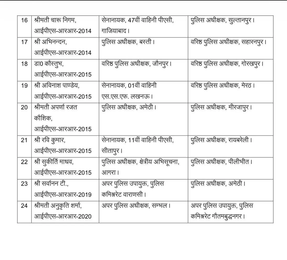 जिलों की कमान में भी व्यापक फेरबदल हुआ है। अविनाश पाण्डेय को मेरठ, डॉ. कौस्तुभ को गोरखपुर और अभिनन्दन को सहारनपुर का नया एसएसपी बनाया गया है। जौनपुर की कमान कुंवर अनुपम सिंह को सौंपी गई है।