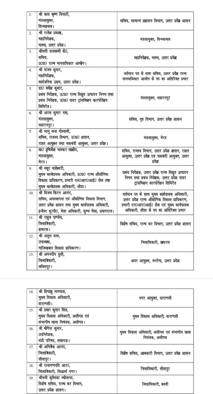 इस तबादला सूची में कई प्रमुख मंडलों के अधिकारियों को बदला गया है। विंध्याचल, सहारनपुर और मेरठ मंडल के कमिश्नर इस प्रशासनिक बदलाव का हिस्सा रहे हैं। बाल कृष्ण त्रिपाठी, जो अब तक विंध्याचल के मंडलायुक्त थे, उन्हें अब उत्तर प्रदेश शासन में सामान्य प्रशासन विभाग का सचिव बनाया गया है। उनकी जगह महानिदेशक मत्स्य राजेश प्रकाश को विंध्याचल मंडल का नया मंडलायुक्त नियुक्त किया गया है। इसके अलावा, मेरठ मंडल के आयुक्त के रूप में भानु चंद्र गोस्वामी को नई जिम्मेदारी दी गई है, जबकि रूपेश कुमार को सहारनपुर का नया मंडलायुक्त नियुक्त किया गया है।