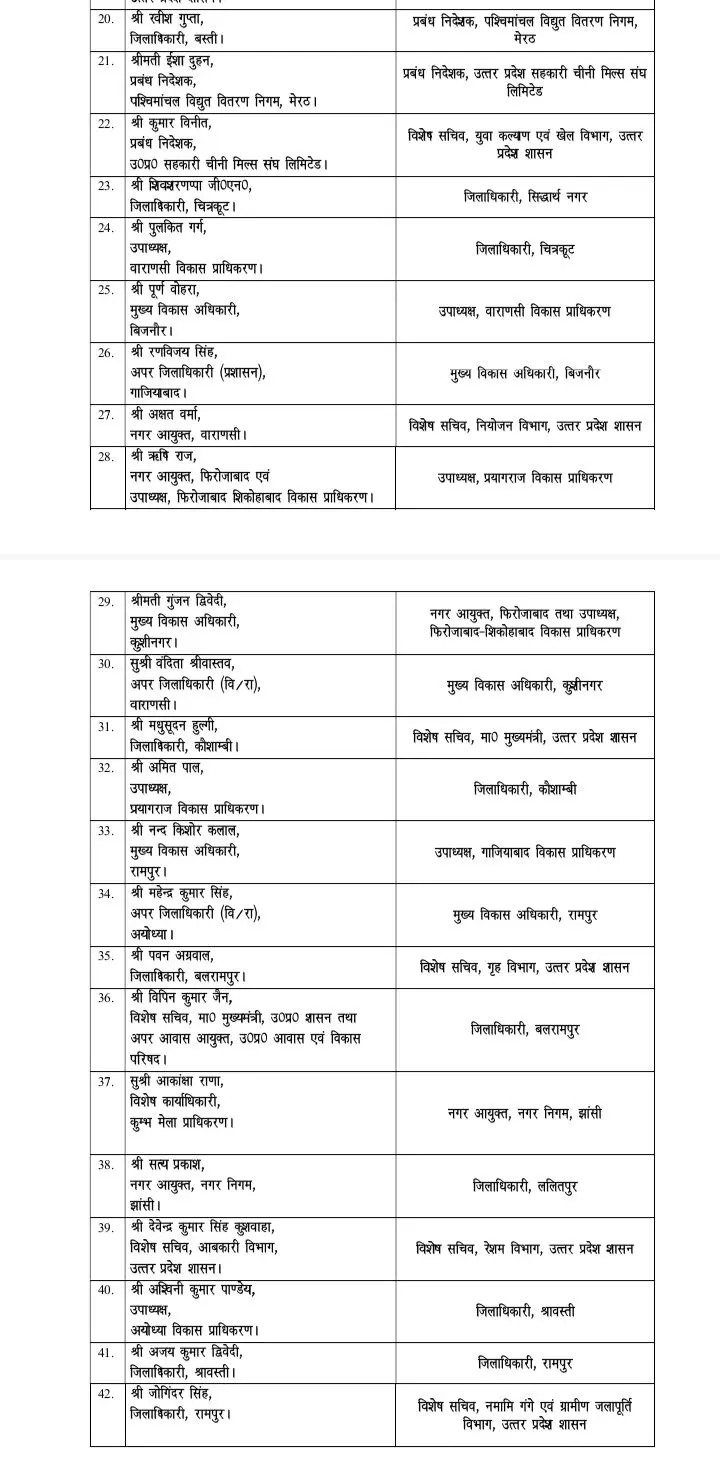 वाराणसी के मुख्य विकास अधिकारी रहे हिमांशु नागपाल को अब वाराणसी का नगर आयुक्त बनाया गया है, जबकि वाराणसी की एडीएम वंदिता श्रीवास्तव को कुशीनगर का सीडीओ बनाया गया है। पूर्व मंडलायुक्त अटल कुमार राय को सचिव गृह विभाग की जिम्मेदारी सौंपी गई है। प्रशासनिक सूत्रों के अनुसार, यह व्यापक फेरबदल शासन की कार्यप्रणाली को और अधिक प्रभावी, पारदर्शी तथा जन-केंद्रित बनाने के लक्ष्य के साथ किया गया है।