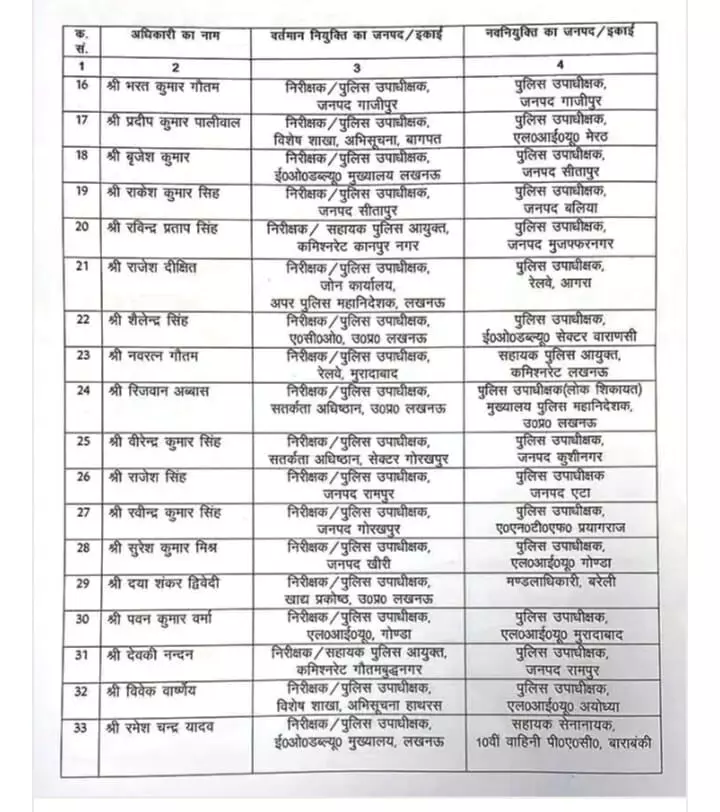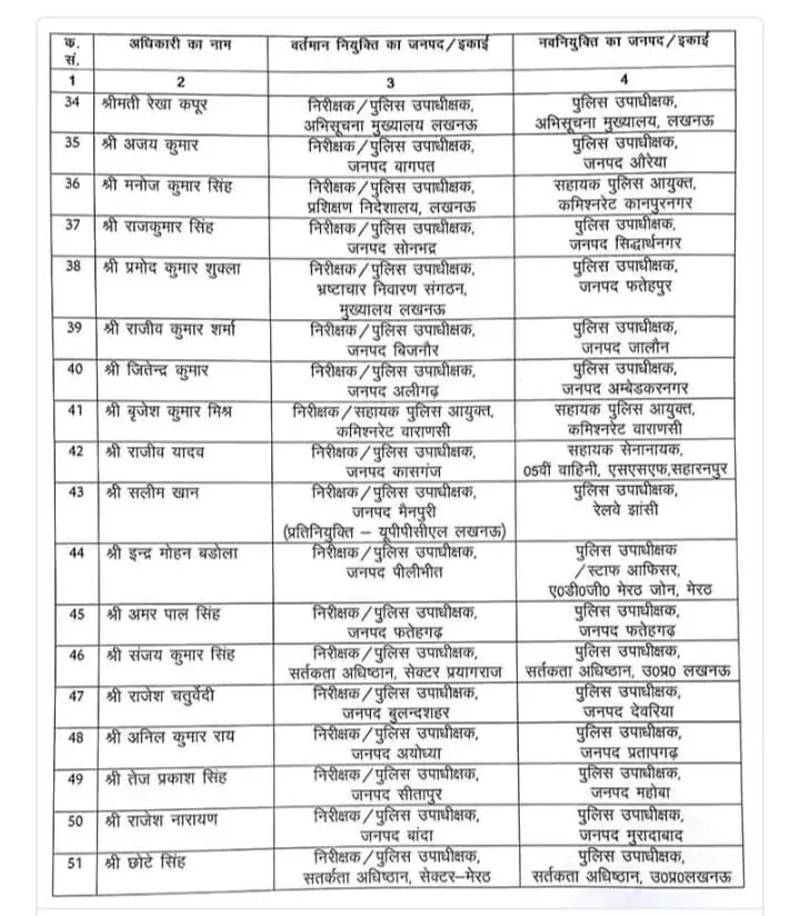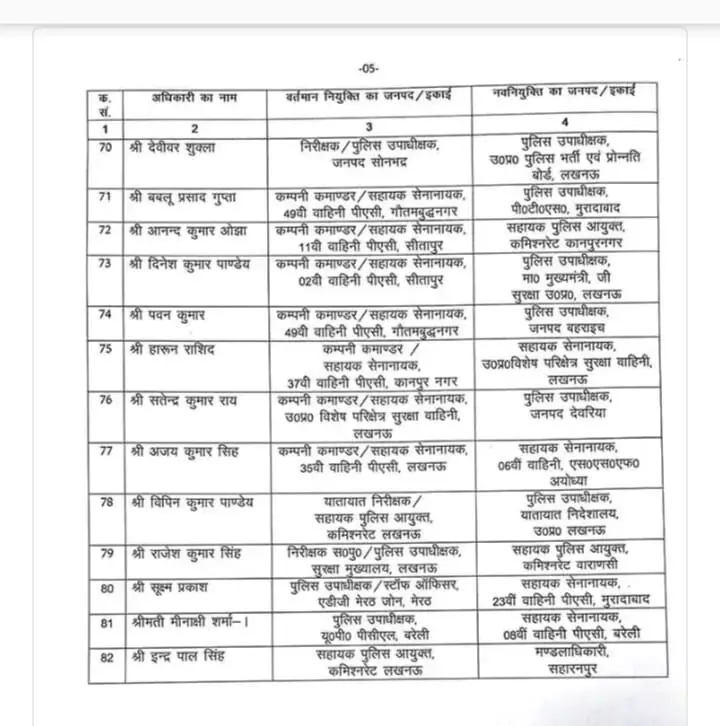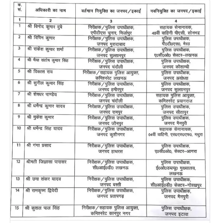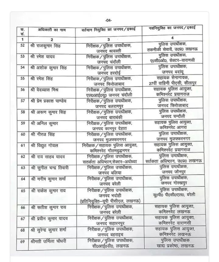 इस क्रम में, कुल 82 डिप्टी एसपी (उप पुलिस अधीक्षक) तबादला कर दिया गया है। तबादला सूची में मुख्य रूप से वे अधिकारी शामिल हैं जो हाल ही में इंस्पेक्टर पद से प्रोन्नत होकर डिप्टी एसपी/सर्किल ऑफिसर (CO) बने हैं।