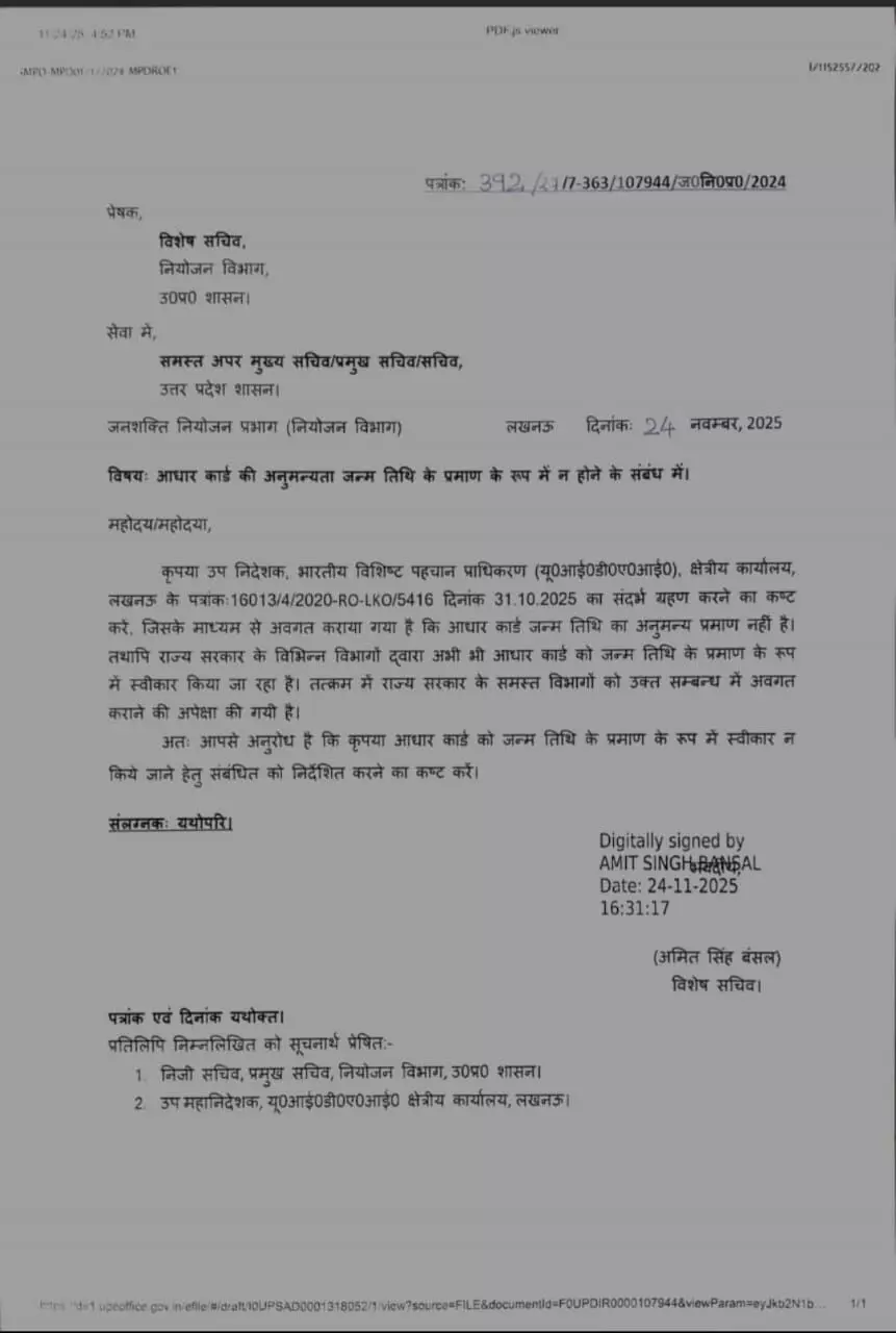 सरकार का यह कदम UIDAI और सुप्रीम कोर्ट के उस रुख की पुष्टि करता है, जिसके अनुसार आधार कार्ड मुख्य रूप से पहचान का प्रमाण है, न कि जन्म तिथि का यह आदेश नियोजन विभाग द्वारा जारी किया गया है और इसका उद्देश्य विभिन्न सरकारी योजनाओं और प्रक्रियाओं में जन्मतिथि सत्यापन की प्रामाणिकता को सुनिश्चित करना है।