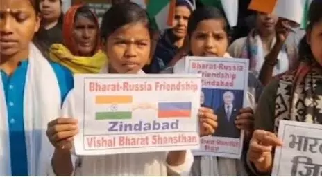 स्थानीय लोगों ने न केवल रूसी राष्ट्रपति की फ्रेम की गई तस्वीर की आरती की, बल्कि उनके सम्मान में एक भव्य 'मैत्री मार्च' भी निकाला। दरसल पुतिन 23वें भारत-रूस वार्षिक शिखर सम्मेलन के लिए नई दिल्ली पहुंच रहे हैं, जिसका उद्देश्य दोनों देशों के बीच विशेष और विशेषाधिकार प्राप्त रणनीतिक साझेदारी को मजबूत करना है।