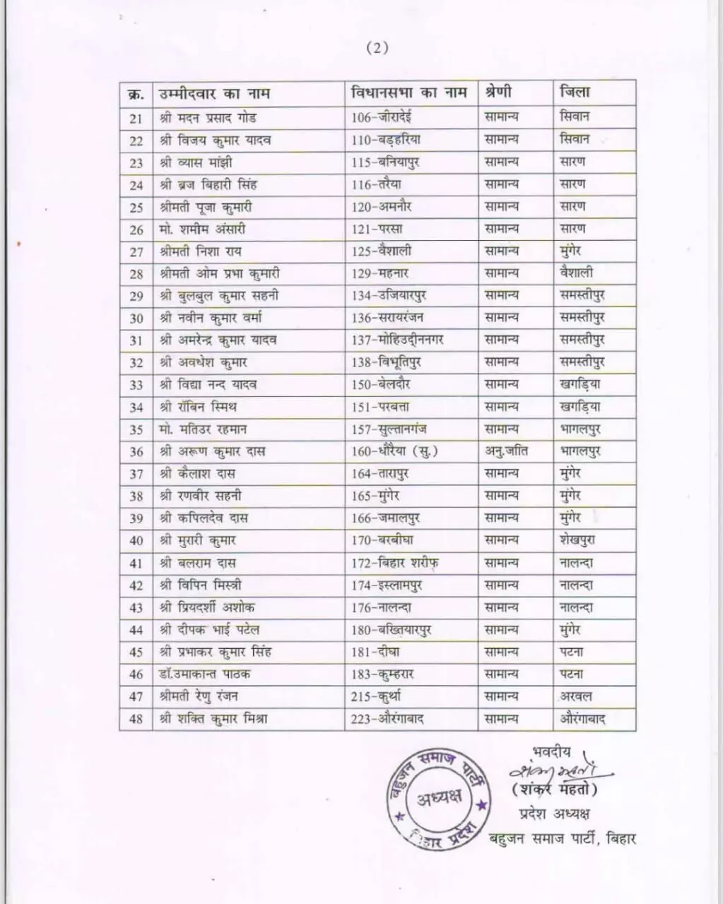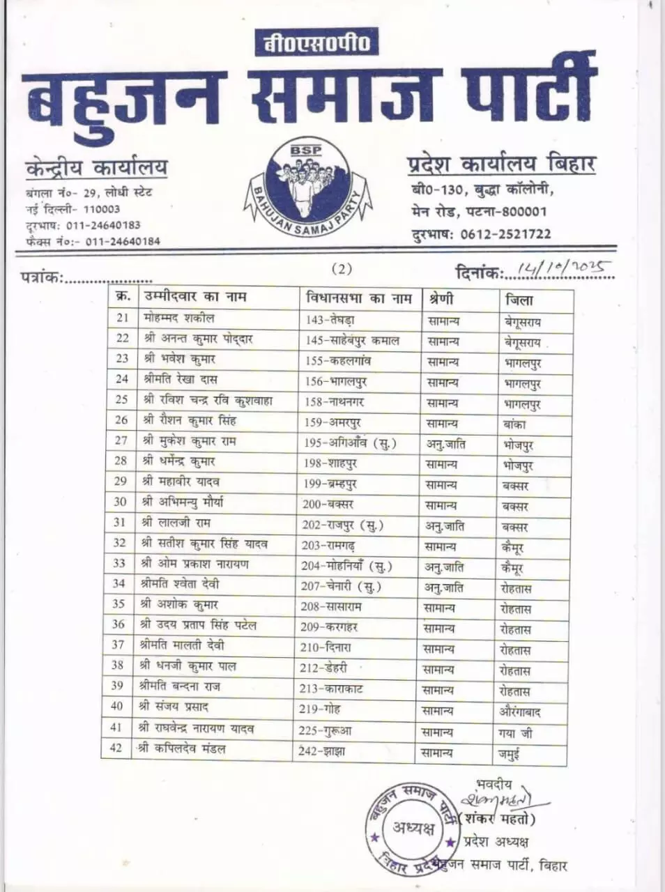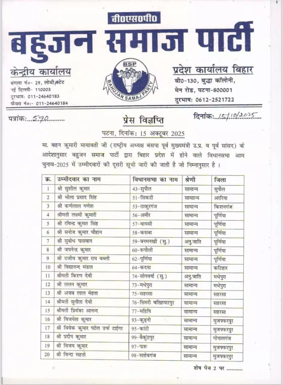 लखनऊ: बहुजन समाज पार्टी ने बिहार विधानसभा चुनाव के लिए 88 उम्मीदवारों की अपनी पहली सूची जारी कर दी है। बसपा सुप्रीमो मायावती ने गुरुवार को यह सूची जारी की। साथ ही, पार्टी ने चुनाव प्रचार के लिए 40 स्टार प्रचारकों के नामों की भी घोषणा की है। यह घोषणा ऐसे समय में हुई है जब बिहार में पहले चरण के नामांकन का अंतिम दिन शुक्रवार को है। बसपा ने साफ कर दिया है कि वह बिहार में मजबूती से चुनाव लड़ने जा रही है और शेष प्रत्याशियों की सूची भी जल्द जारी होगी।
