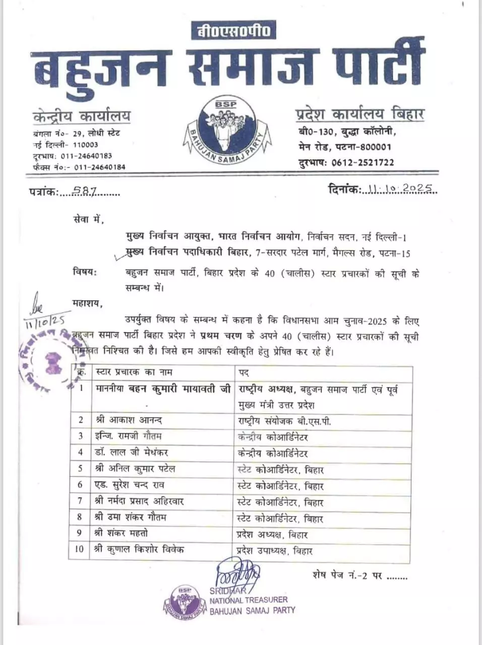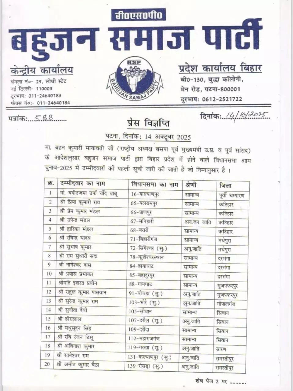 बिहार चुनाव: बिहार चुनाव के लिए बसपा ने जारी की 88 प्रत्याशियों और 40 स्टार प्रचारकों की सूची!