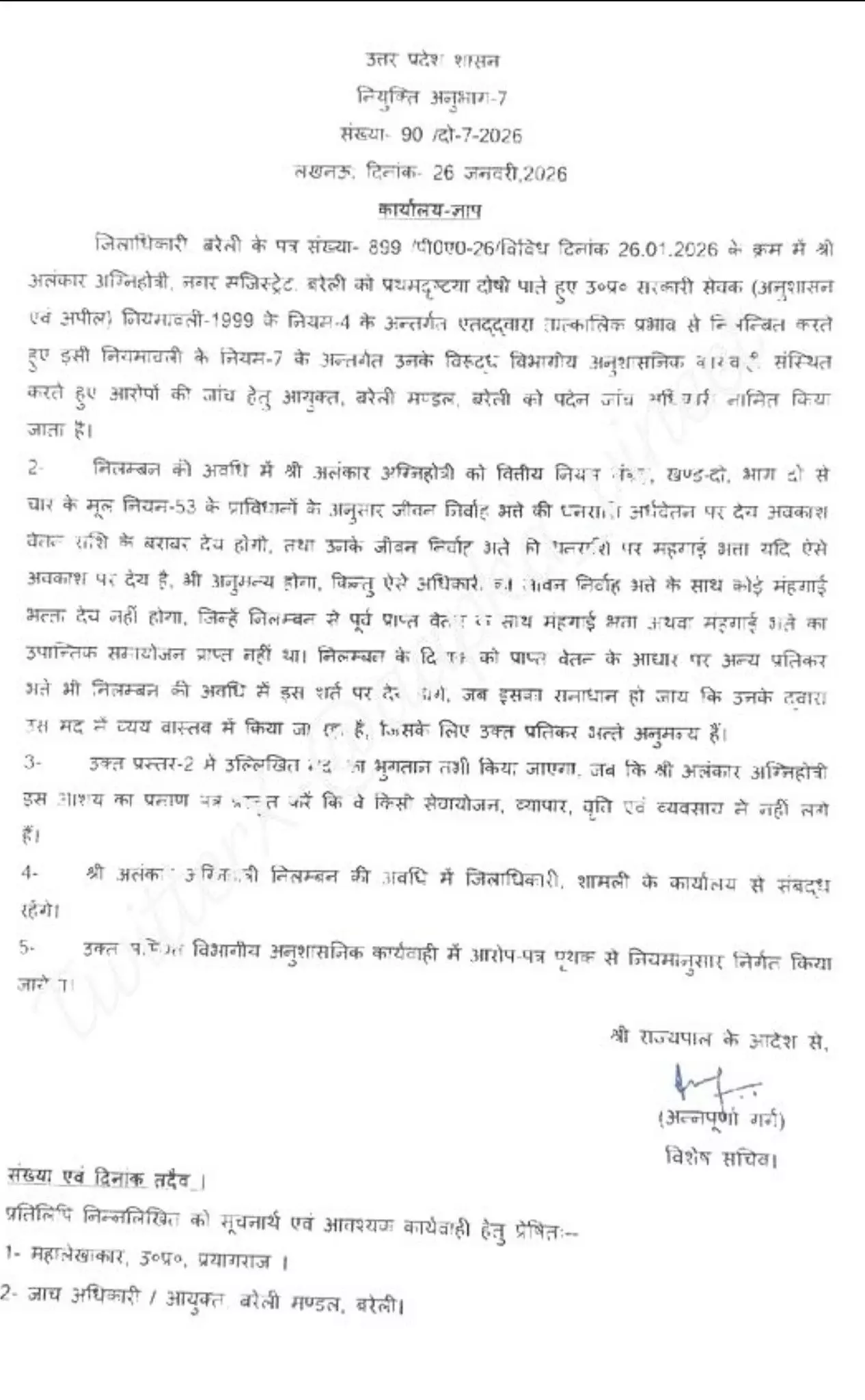 बरेली के कमिश्नर को जांच अधिकारी नियुक्त किया है, जो अलंकार अग्निहोत्री द्वारा लगाए गए आरोपों की विस्तृत जांच करेंगे।