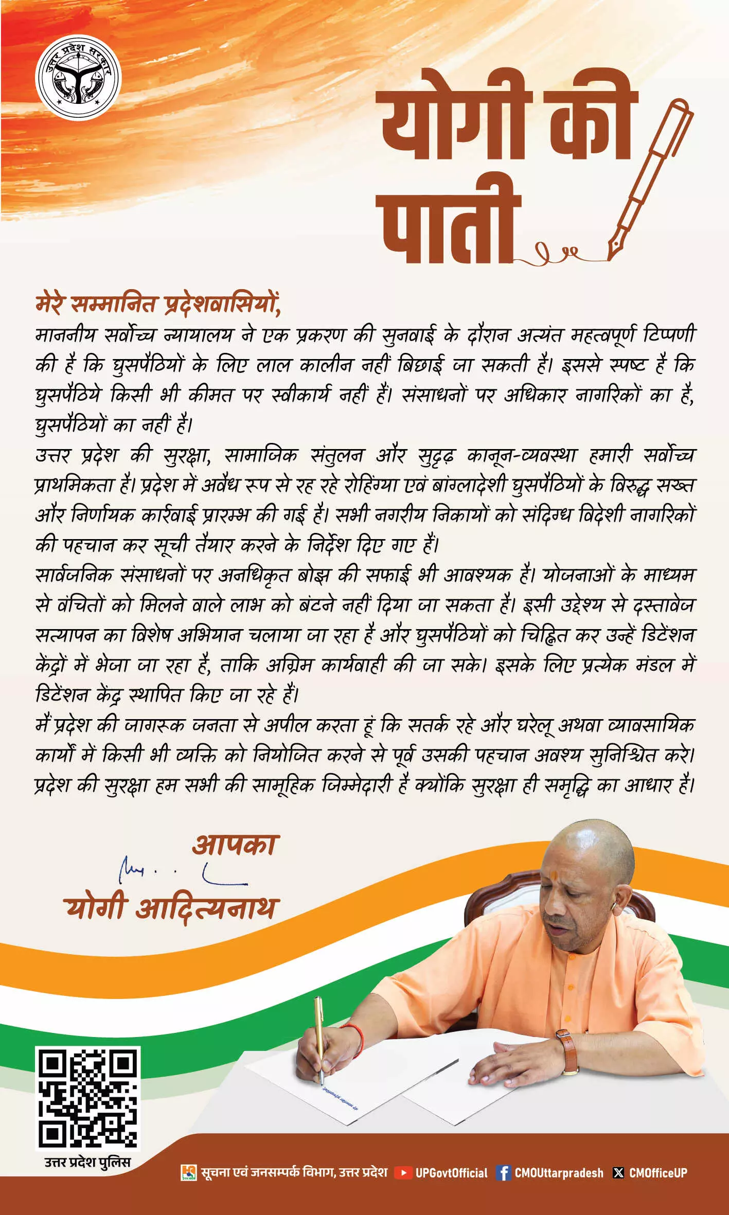 यूपी की सुरक्षा सर्वोपरि: सीएम योगी ने प्रदेशवासियों से अवैध घुसपैठियों की पहचान में मांगा सहयोग, कहा- "बर्दाश्त नहीं"