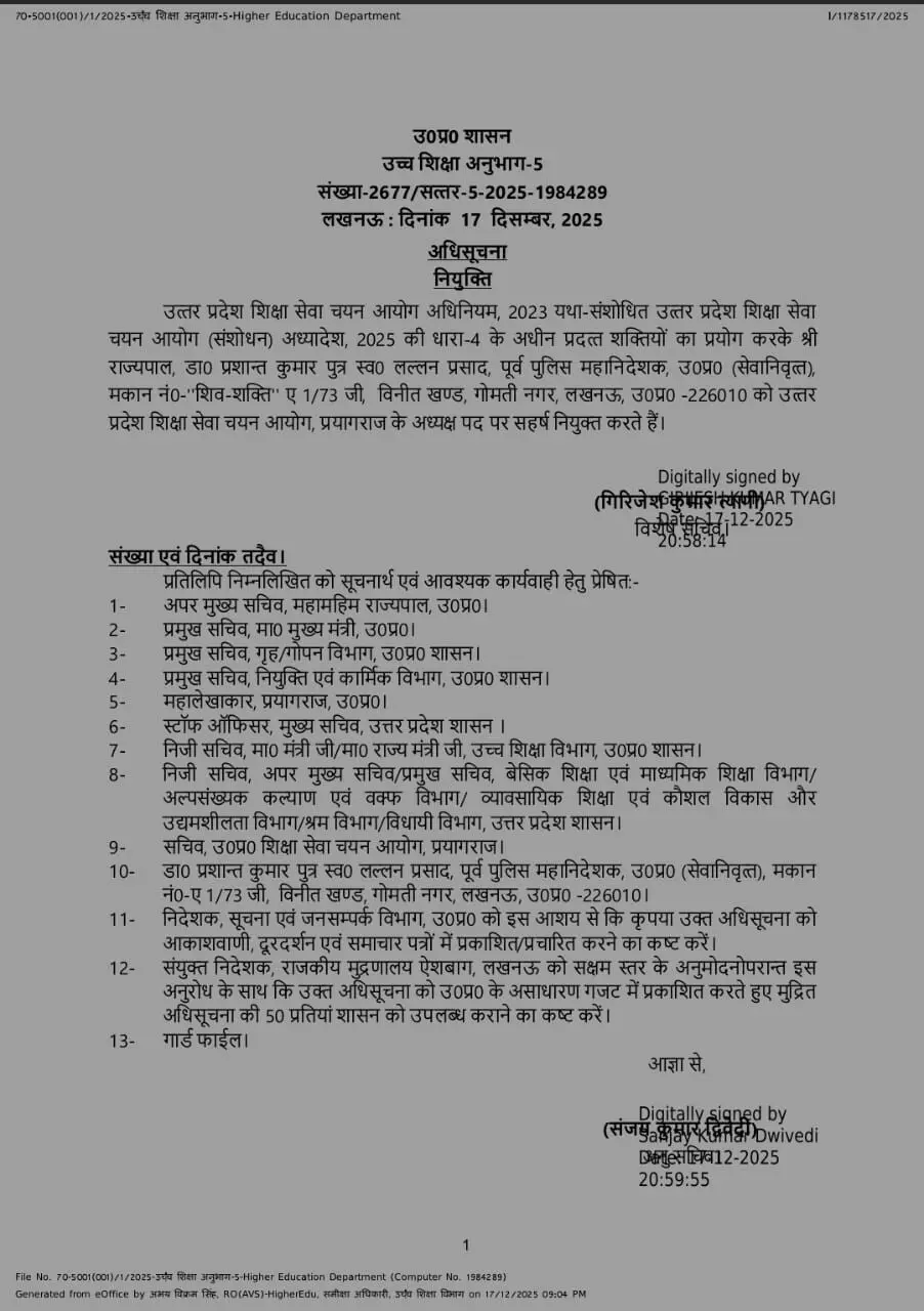 लखनऊ : उत्तर प्रदेश सरकार ने एक महत्वपूर्ण निर्णय लेते हुए राज्य के पूर्व पुलिस महानिदेशक प्रशांत कुमार को 'उत्तर प्रदेश शिक्षा सेवा चयन आयोग' का नया अध्यक्ष नियुक्त किया है।