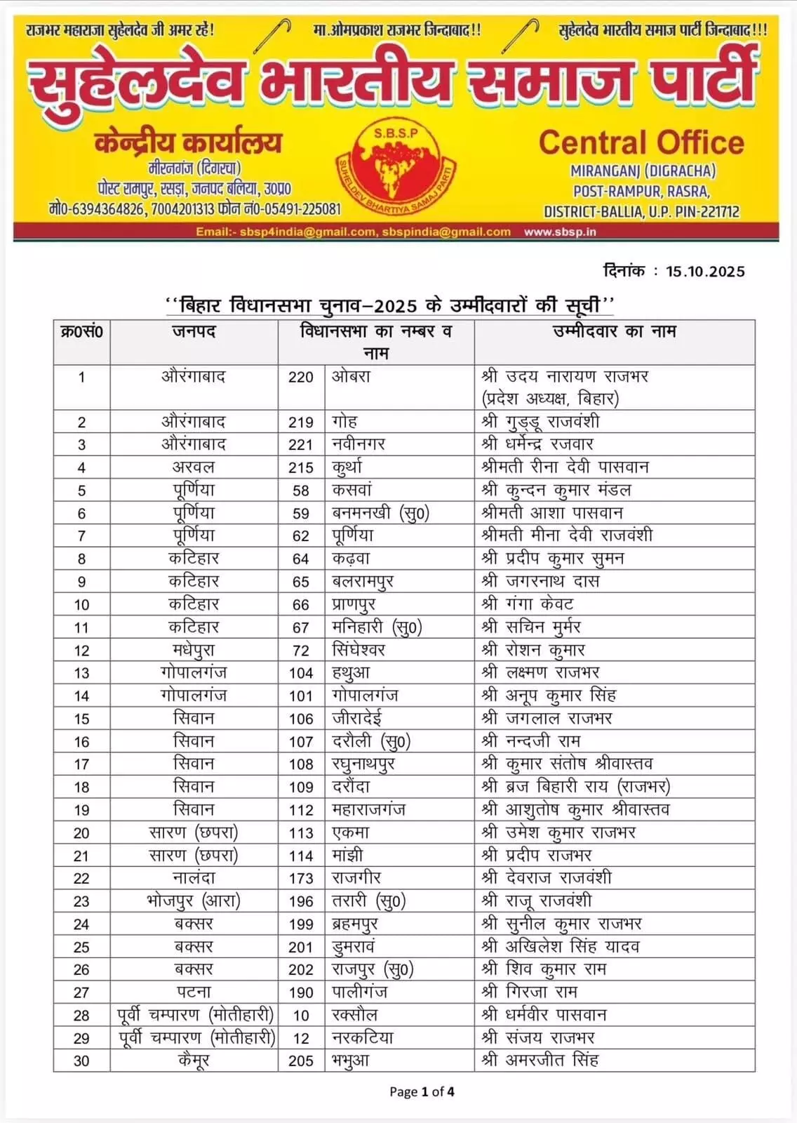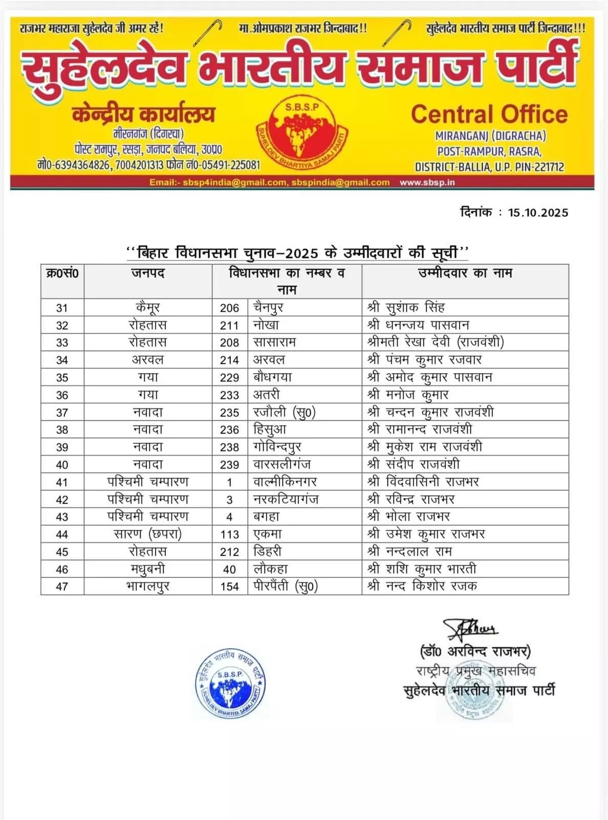 लखनऊ/पटना : सुहेलदेव भारतीय समाज पार्टी (SBSP) ने बिहार विधानसभा चुनाव 2025 के लिए अपनी चुनावी रणनीति स्पष्ट करते हुए, आज अपने प्रत्याशियों की पहली सूची जारी कर दी है। पार्टी के राष्ट्रीय प्रमुख महासचिव डॉ. अरविंद राजभर द्वारा जारी सूची में बिहार की कुल 47 विधानसभा सीटों के लिए उम्मीदवारों के नामों की घोषणा की गई है। यह कदम तब उठाया गया है जब SBSP प्रमुख ओमप्रकाश राजभर ने स्पष्ट कर दिया था कि यदि बिहार में उनका गठबंधन एनडीए के साथ नहीं होता है, तो पार्टी अकेले चुनाव लड़ेगी।
