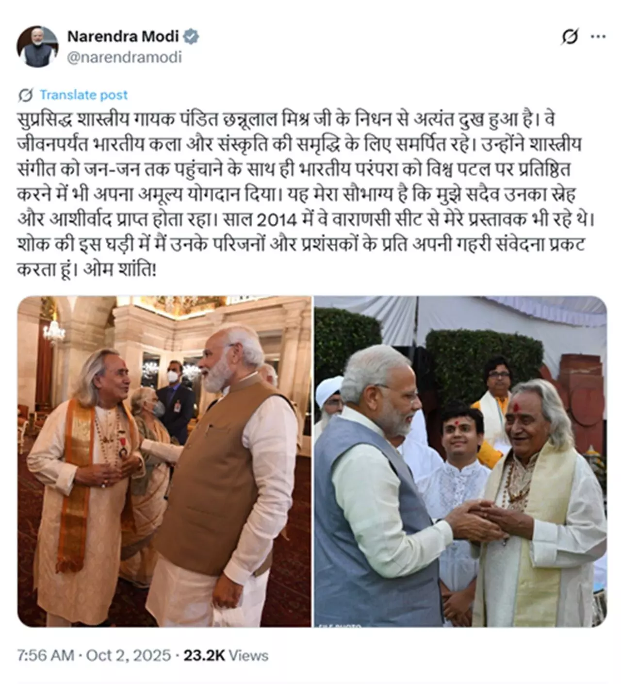पंडित छन्नूलाल मिश्र जी के निधन पर PM मोदी ने जताया शोक
