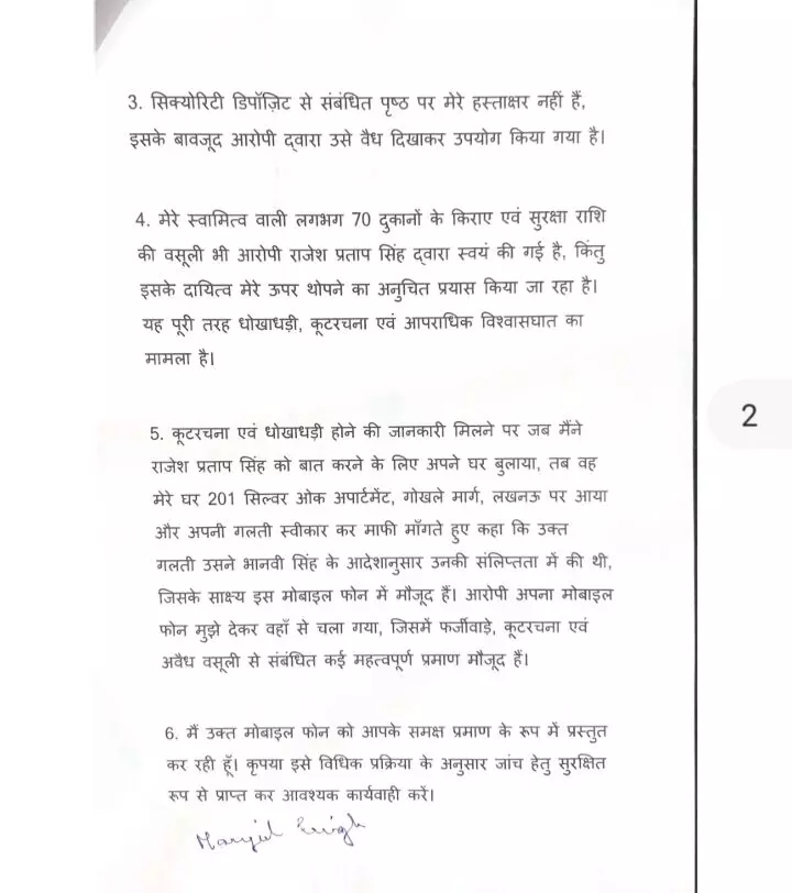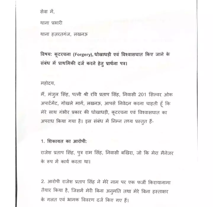 शिकायत में मंजुल सिंह, जो 201 सिल्वर ओक अपार्टमेंट, गोखले मार्ग, लखनऊ की निवासी हैं, ने पुलिस को दिए गए प्रार्थना पत्र में विस्तार से घटनाक्रम बताया है। उनका मुख्य आरोप है कि उनके मैनेजर राजेश प्रताप सिंह,ने उनकी बिना किसी अनुमति या जानकारी के, उनके नाम पर एक फर्जी किरायानामा तैयार कर लिया।