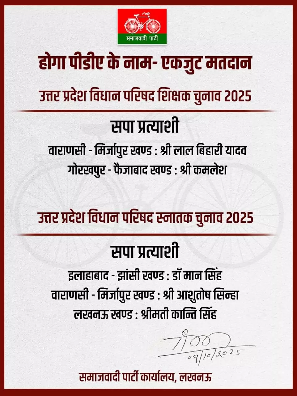 स्नातक निर्वाचन क्षेत्रों के लिए समाजवादी पार्टी ने तीन महत्वपूर्ण नाम घोषित किए हैं, जिनमें से दो ऐसे हैं जो पिछले चुनाव में अपनी सीट बचाने में सफल रहे थे।