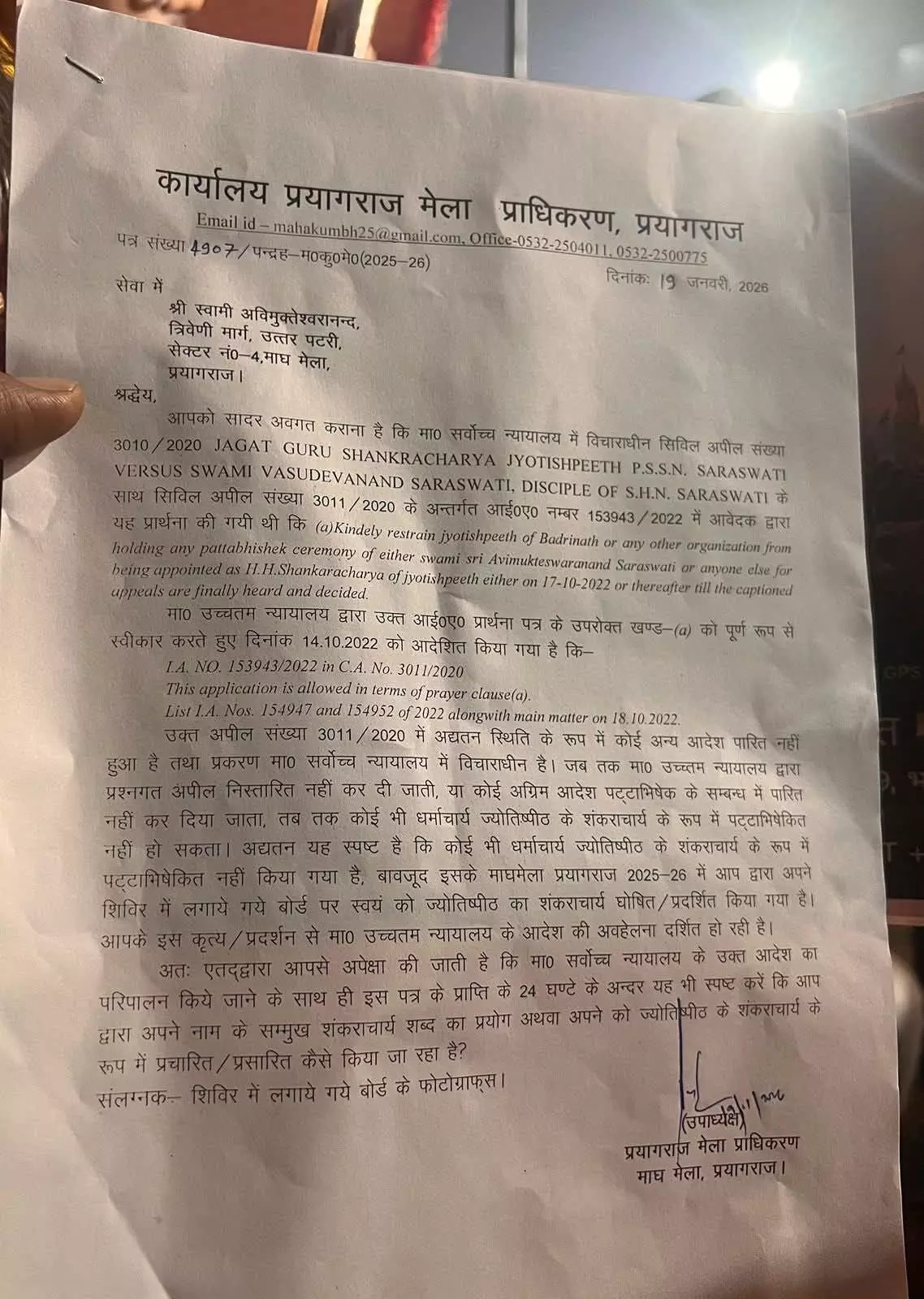 इस नोटिस और स्वामी अविमुक्तेश्वरानंद के कड़े रुख ने माघ मेले के वातावरण में भारी तनाव पैदा कर दिया है।