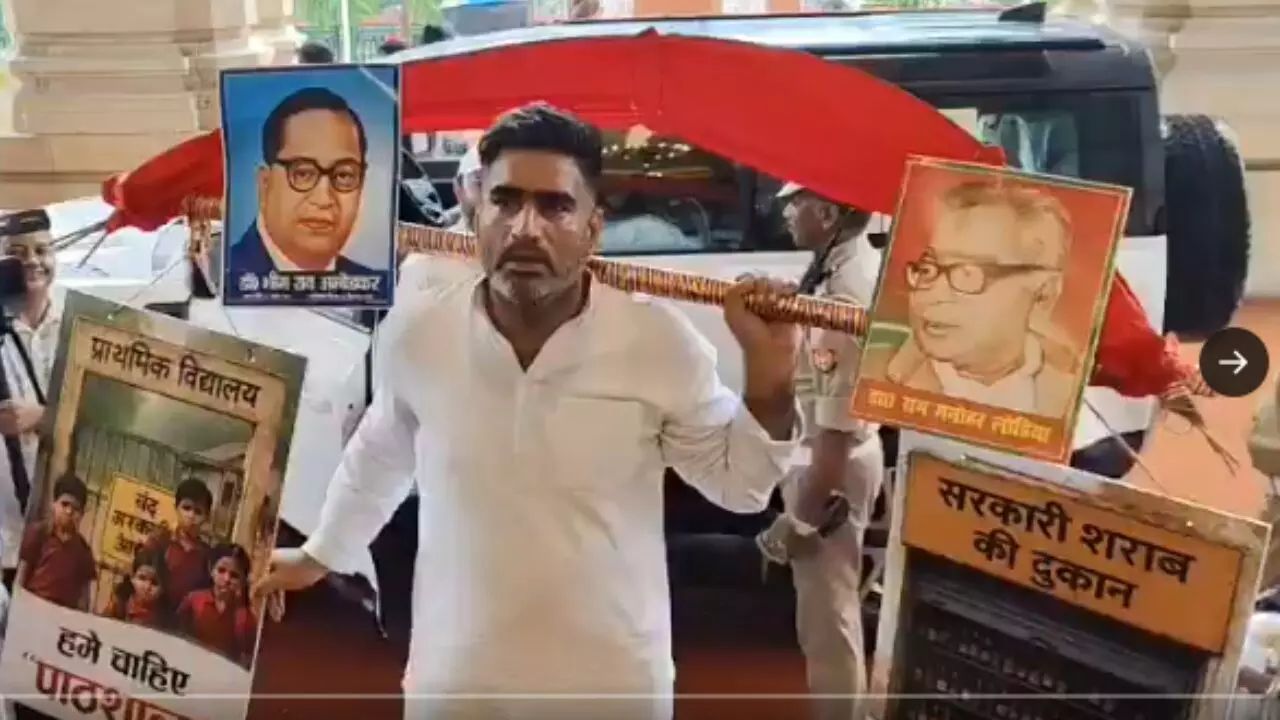UP Monsoon Session 2025: उत्तर प्रदेश विधानसभा का मॉनसून सत्र आज (11 अगस्त 2025, सोमवार) से शुरू हो गया। विपक्षी दल समाजवादी पार्टी (सपा) ने शराब नीति, भ्रष्टाचार, बेरोजगारी और स्कूल मर्जीकरण के खिलाफ जोरदार प्रदर्शन किया। अतुल प्रधान कांवड़ लेकर विधानसभा पहुंचे। अन्य विधायकों ने भी पोस्टर-बैनर के साथ अनोखे अंदाज में विरोध प्रदर्शन किया।