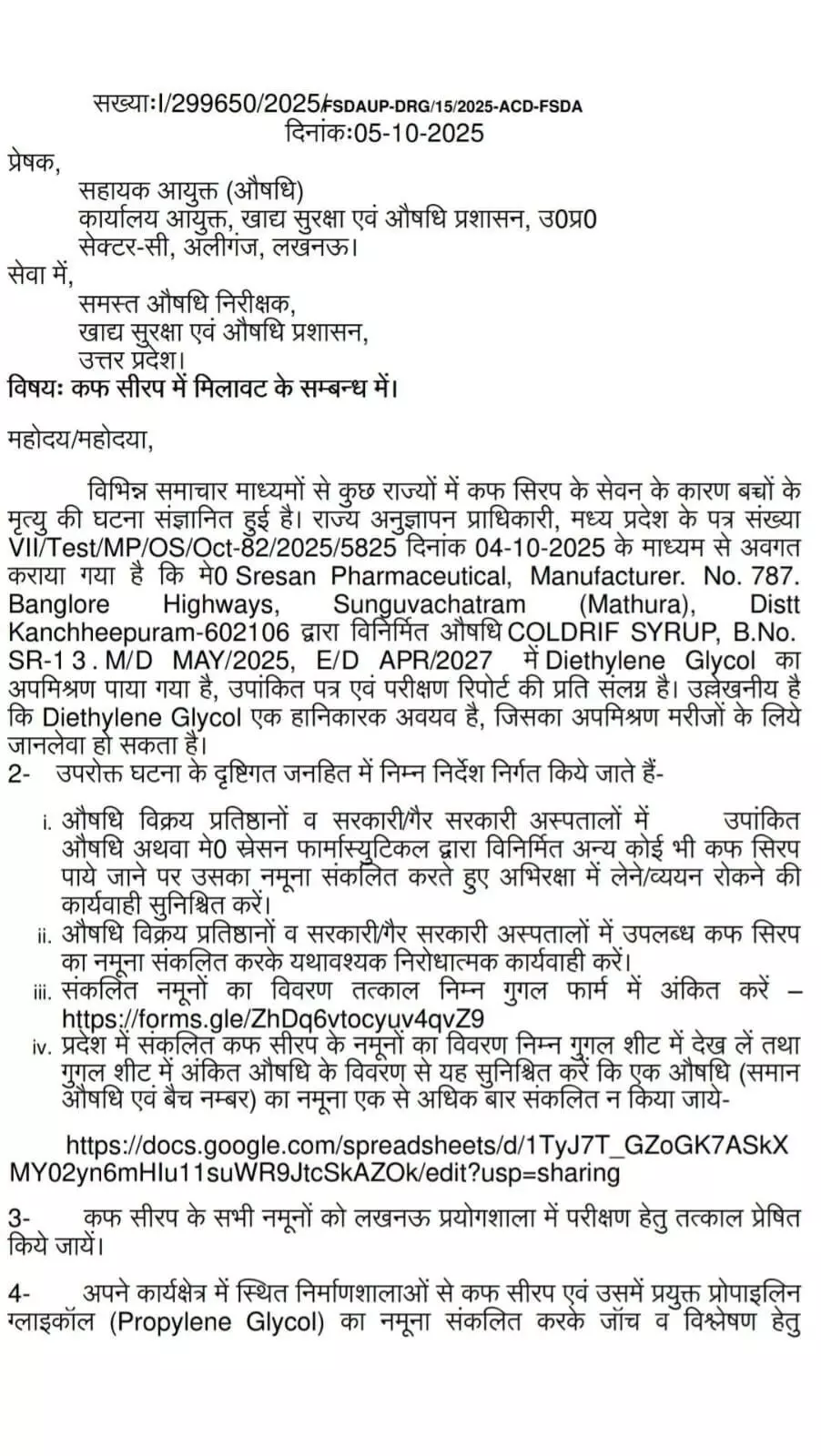 एफएसडीए के मुताबिक, कोल्ड्रिफ सिरप के बैच नंबर एसआर-13 (एम/डी मई/2025, ई/डी अप्रैल/2027) में यह मिलावट पाई गई है। यह सिरप राजस्थान और मध्य प्रदेश में भी बच्चों के लिए घातक साबित हुआ है, जिसके बाद उत्तर प्रदेश में सतर्कता बढ़ा दी गई है।