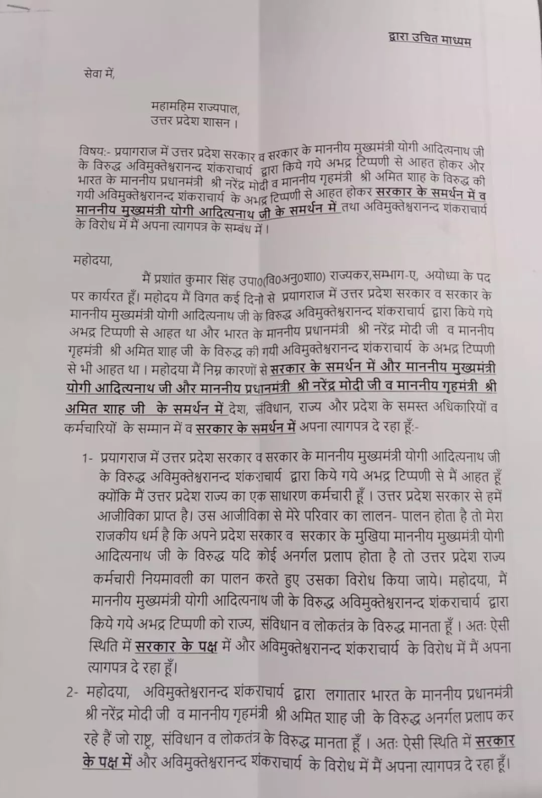 प्रशांत सिंह ने अपने त्यागपत्र में स्पष्ट रूप से उल्लेख किया है कि मुख्यमंत्री योगी आदित्यनाथ न केवल प्रदेश के मुखिया हैं, बल्कि एक सन्यासी और करोड़ों लोगों की आस्था के केंद्र भी हैं।