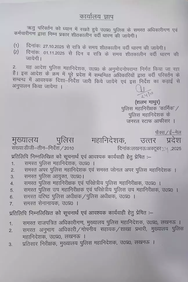 लखनऊ : उत्तर प्रदेश पुलिस के कर्मियों के लिए शीतकालीन वर्दी पहनने का आदेश जारी कर दिया गया है। पुलिस महानिदेशक कार्यालय द्वारा जारी इस निर्देश के बाद, राज्य के पुलिसकर्मी अब निर्धारित तिथियों से ठंडी के मौसम की वर्दी धारण करेंगे। यह आदेश डीजीपी के स्टाफ ऑफिसर शलभ माथुर ने जारी किया है।