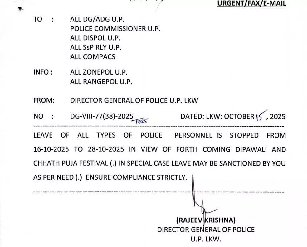लखनऊ : उत्तर प्रदेश में आगामी दीपावली और छठ पर्व के मद्देनज़र, कानून-व्यवस्था को सुदृढ़ करने के लिए पुलिस महानिदेशक (DGP) राजीव कृष्ण ने एक बड़ा फैसला लिया है। डीजीपी मुख्यालय द्वारा जारी आदेश के अनुसार, आज, यानी बृहस्पतिवार से लेकर आगामी 28 अक्टूबर तक, सभी रैंक के पुलिसकर्मियों की छुट्टियां तत्काल प्रभाव से निरस्त कर दी गई हैं। यह निर्णय त्योहारों के इस संवेदनशील समय में राज्य भर में सुरक्षा व्यवस्था को मजबूत बनाए रखने और किसी भी अप्रिय घटना को रोकने के उद्देश्य से लिया गया है। इस आदेश का सख्ती से पालन सुनिश्चित करने के लिए सभी संबंधित अधिकारियों को निर्देश जारी कर दिए गए हैं।
