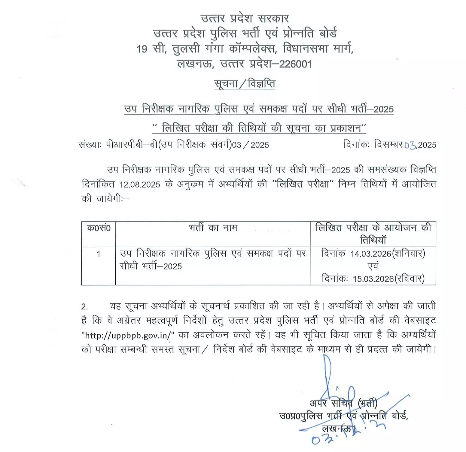 यूपी पुलिस दरोगा भर्ती: लिखित परीक्षा की तारीखें घोषित, मार्च 2026 में होगा आयोजन