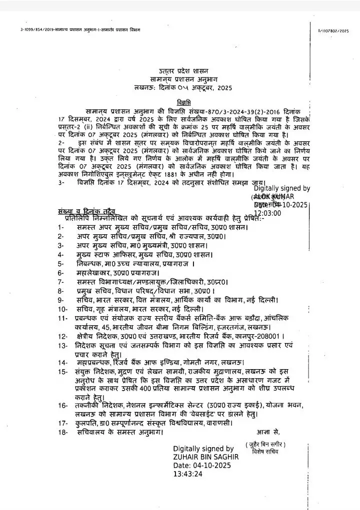 यूपी में 7 अक्टूबर को सार्वजनिक अवकाश: महर्षि वाल्मीकि जयंती के छुट्टी का आदेश जारी, योगी ने किया था ऐलान