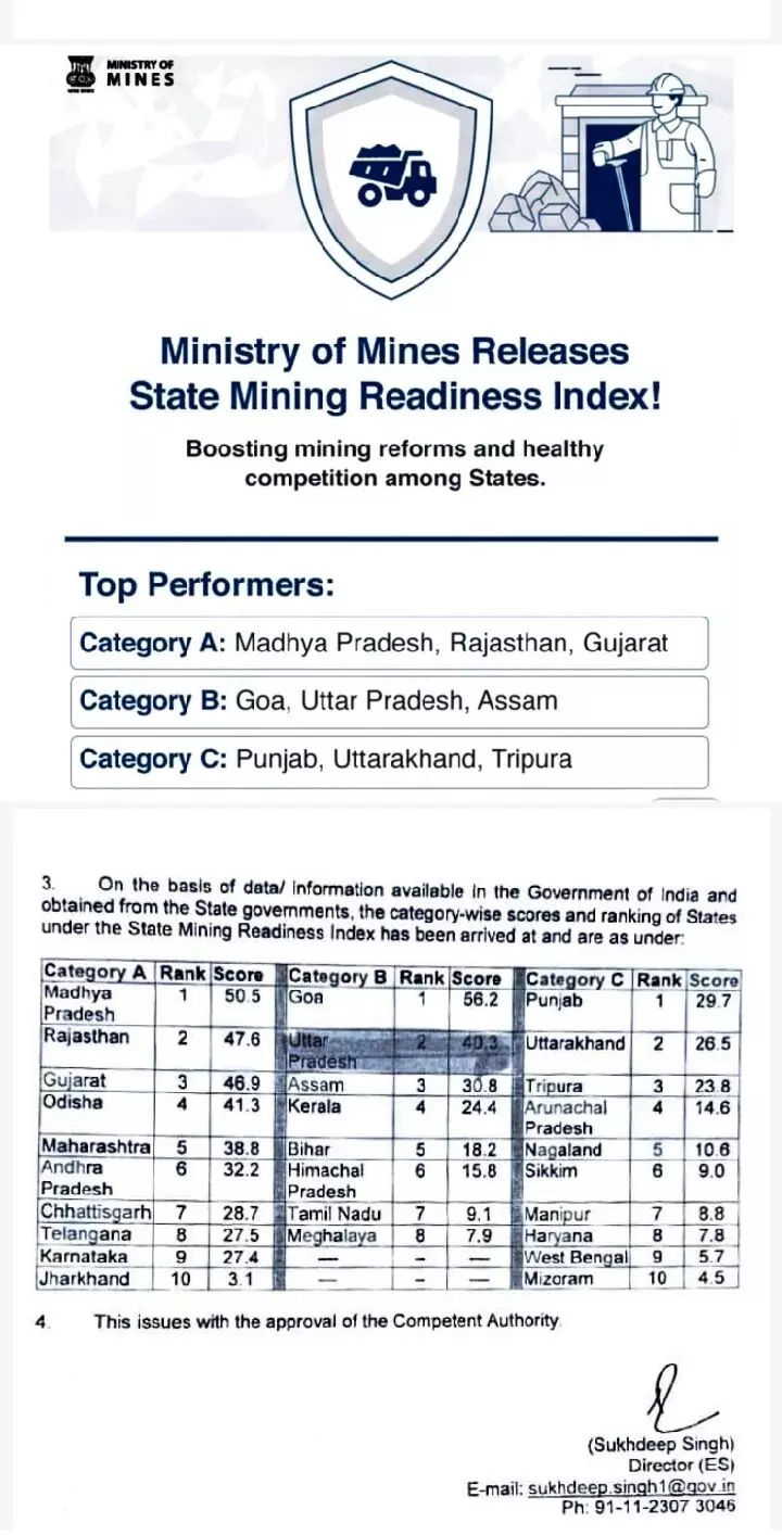 खनन क्षेत्रफल के आधार पर राज्यों को 'ए', 'बी' और 'सी' श्रेणियों में बांटा गया है। 'बी' श्रेणी में उत्तर प्रदेश सहित कुल आठ राज्य शामिल हैं, जिनमें गोवा 56.2 अंक के साथ पहले स्थान पर रहा है। उत्तर प्रदेश के बाद, 30.8 अंकों के साथ असम तीसरे स्थान पर, केरल 24.4 अंकों के साथ चौथे और बिहार 18.2 अंकों के साथ पांचवें नंबर पर रहा है। इसके अतिरिक्त, हिमाचल प्रदेश, तमिलनाडु और मेघालय छठवें, सातवें और आठवें स्थान पर रहे हैं। यह रैंकिंग राज्यों के बीच खनिज क्षेत्र में नवाचार और सुधारों को अपनाने की होड़ को उजागर करती है। वहीं, 'ए' श्रेणी के राज्यों में मध्य प्रदेश और 'सी' श्रेणी के राज्यों में पंजाब ने अपनी-अपनी श्रेणियों में पहला स्थान प्राप्त किया है।