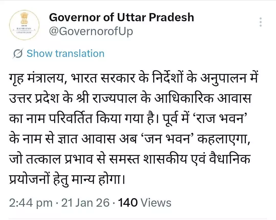 उत्तर प्रदेश में 'राजशाही' के प्रतीक का अंत: अब 'जन भवन' कहलाएगा राजभवन, राज्यपाल आवास का नाम बदला