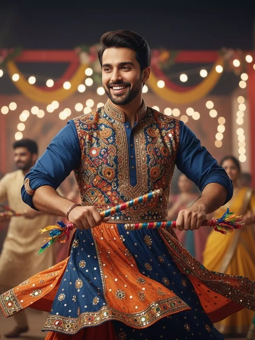 एक सुंदर युवक की बहुत असली जैसी फोटो बनाएं, जो डांडिया खेल रहा है। वह रंगीन ट्रेडिशनल कुर्ता-पायजामा पहने हो, जिस पर सुंदर कढ़ाई और शीशे का काम है। हाथ में सजाए हुए डांडिया स्टिक्स लेकर वह gracefully घूम रहा है। पीछे नवरात्रि का रंगीन और lively माहौल है, जहां और लोग भी नाच रहे हैं और दीयों-लाइट्स से जगह सजाई गई है। फोटो थोड़े नीचे से ली गई है ताकि उसकी खुशी और जोश अच्छे से दिख सके।