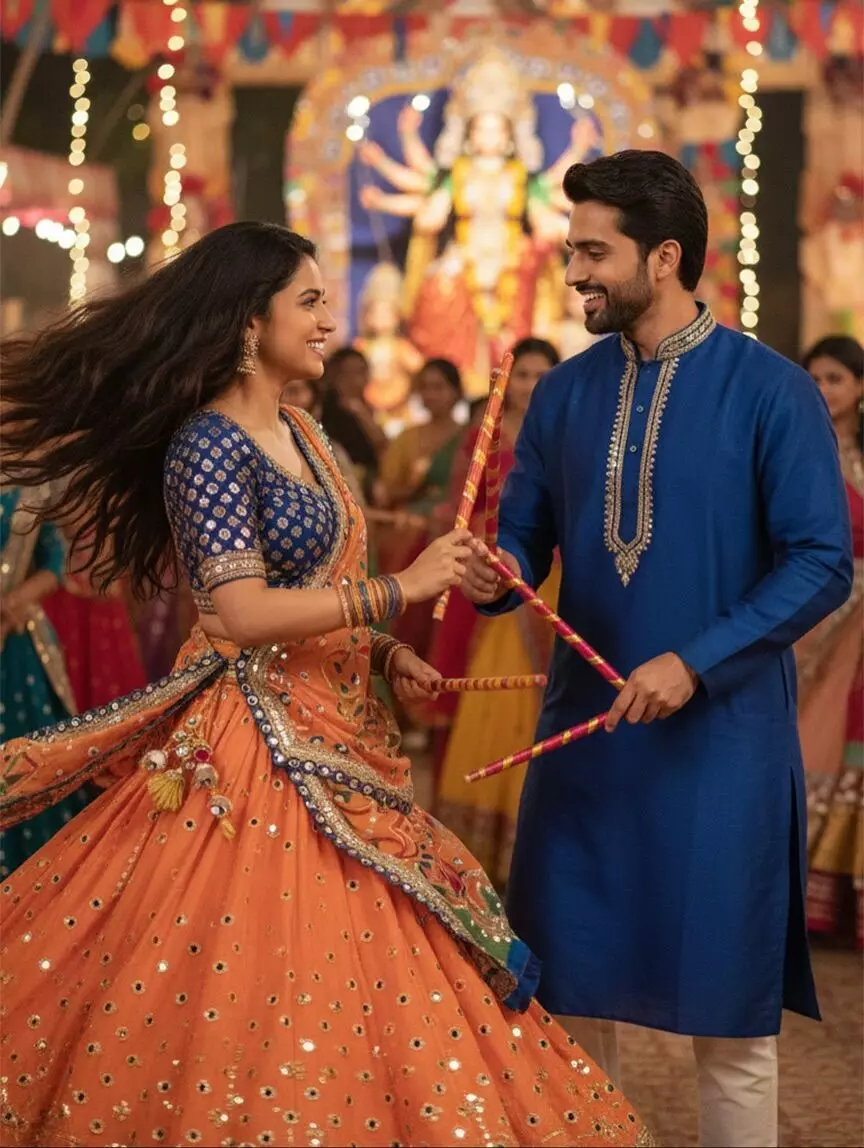 एक खूबसूरत महिला और एक सुंदर पुरुष की बहुत असली जैसी सिनेमाई फोटो बनांए, जो साथ में डांडिया खेल रहे हो। महिला के चेहरे पर मुस्कान हो, उसके बाल घूमते हुए उड़ रहे हो, और वह रंगीन पारंपरिक घाघरा चोली पहनी हो जिसमें सुंदर कढ़ाई और शीशे का काम है। उसके साथ पुरुष भी उतनी ही ऊर्जा के साथ डांडिया खेल रहा है, उसने भी रंग-बिरंगा कुर्ता-पायजामा पहना है जिस पर सुंदर कढ़ाई और शीशे की सजावट है। दोनों नाचते हुए बीच में डांडिया खेल रहे हैं, उनकी खुशी और त्योहार का जोश साफ दिख रहा हो। पीछे नवरात्रि का रंगीन और lively माहौल है, जिसमें और लोग नाच रहे हो, झिलमिलाती लाइटें और सुंदर सजावट है। फोटो को थोड़े नीचे से लिया गया है ताकि उनकी ऊर्जा, तालमेल और त्योहार की खुशी बेहतर नजर आए।