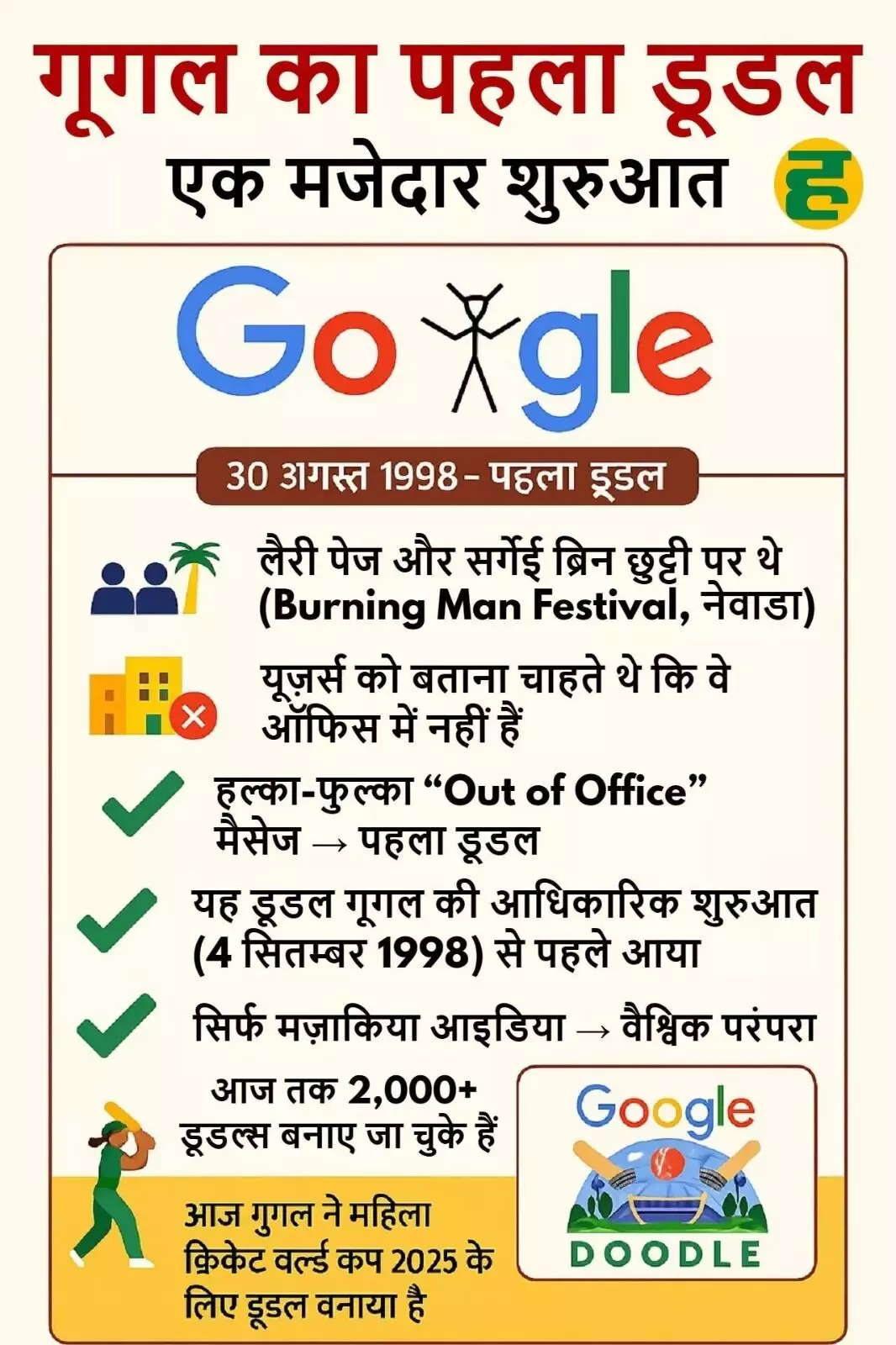 गूगल ने अपना पहला डूडल 30 अगस्त 1998 को बनाया था। गूगल के सह-संस्थापक लैरी पेज और सर्गेई ब्रिन उस समय अमेरिका के नेवाडा रेगिस्तान में आयोजित मशहूर बर्निंग मैन फेस्टिवल में छुट्टियां बिताने जा रहे थे।
