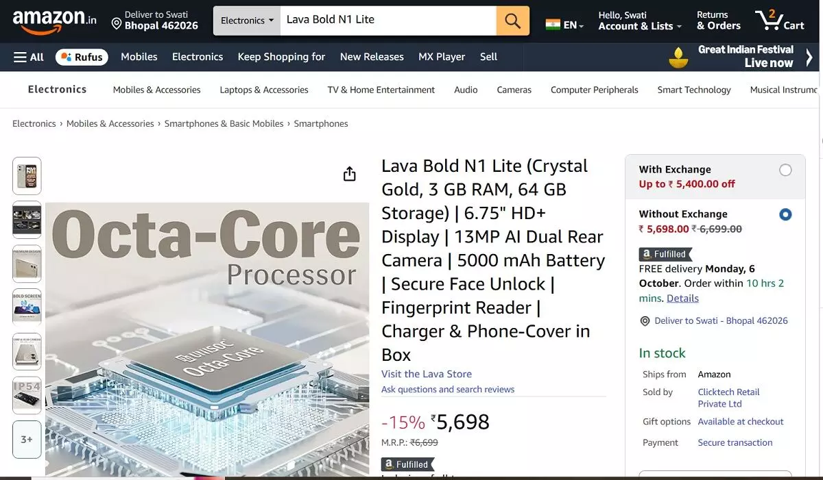 सिर्फ ₹5,698 लॉन्च होगा Lava Bold N1 Lite: अमेजन लिस्टिंग में कीमत लीक, मिलेगी 5,000mAh बैटरी, 13MP कैमरा
