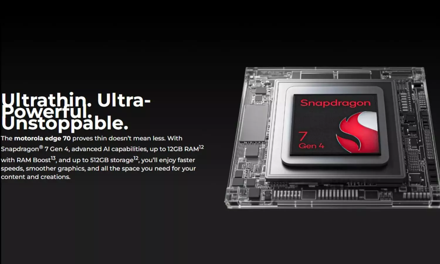 यह स्मार्टफोन Qualcomm Snapdragon 7 Gen 4 प्रोसेसर पर काम करता है, जिसे 8GB LPDDR5x रैम और 256GB UFS 3.1 स्टोरेज के साथ जोड़ा गया है। Motorola Edge 70 Android 16 पर आधारित Hello UI के साथ आता है। कंपनी इसमें 3 मेजर Android अपडेट और 4 साल के सिक्योरिटी अपडेट देने का वादा कर रही है।