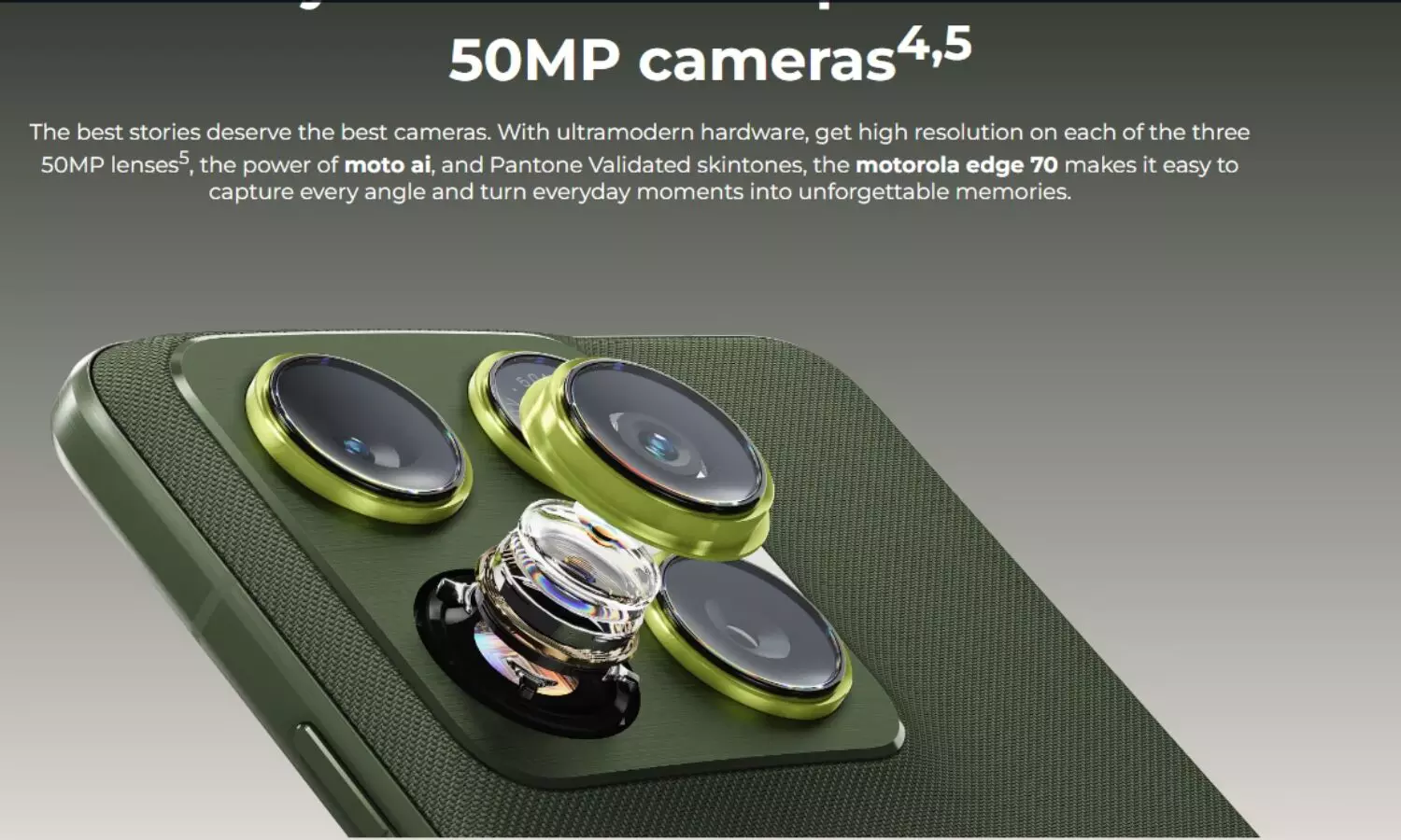 फोटोग्राफी के लिए Motorola Edge 70 में 50MP का ट्रिपल रियर कैमरा सेटअप दिया गया है। इसमें OIS के साथ प्राइमरी कैमरा, 50MP अल्ट्रा-वाइड कैमरा और थ्री-इन-वन लाइट सेंसर शामिल है। फ्रंट में भी 50MP का सेल्फी कैमरा मिलता है। यह फोन 4K 60fps वीडियो रिकॉर्डिंग सपोर्ट करता है और इसमें AI Video व Photo Enhancement फीचर्स भी मौजूद हैं।