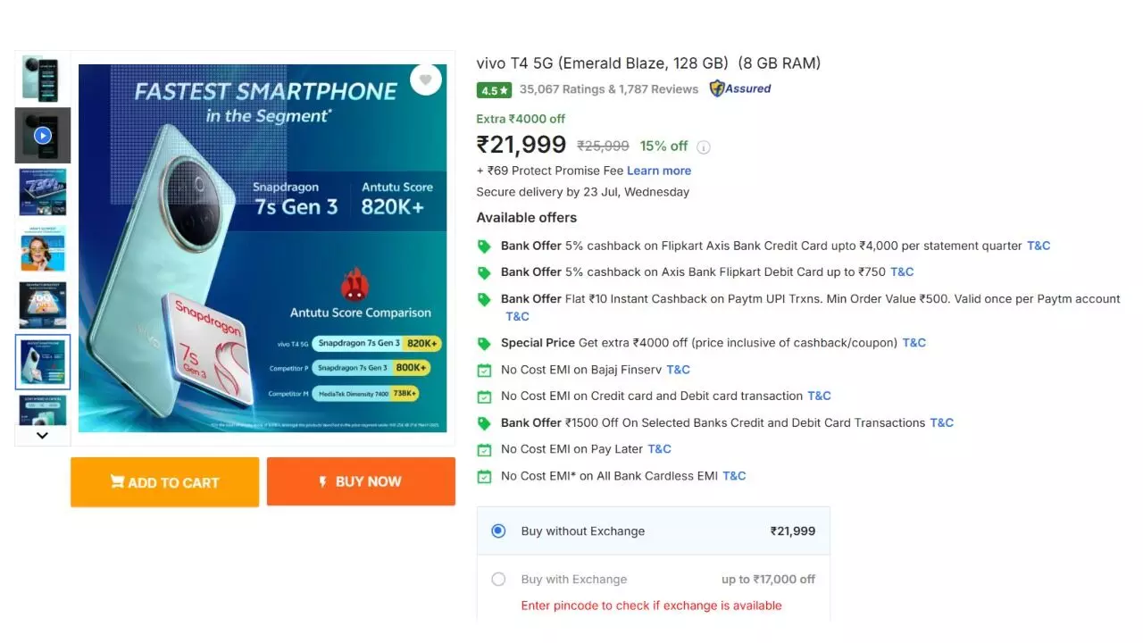 वीवो टी 4 5जी फोन का बेस वेरिएंट 8GB रैम और 128GB स्टोरेज के साथ आता है, जिसकी MRP 25,999 रुपए है। हालांकि, फ्लिपकार्ट पर यह फोन अभी 4,000 रुपए की सीधी छूट के बाद 21,999 रुपए में उपलब्ध है। इसके साथ ही कंपनी एक्सचेंज ऑफर के तहत 17,000 रुपए तक की अतिरिक्त छूट देने का वादा कर रही है, जिससे इसपर मिलने वाला कुल डिस्काउंट 21,000 रुपए हो जाती है। ऐसे में अगर आप पूरा डिस्काउंट पाने में कामयाब हो जाते हैं तो यह स्मार्टफोन आपको महज 4,999 रुपए में मिल जाएगा।