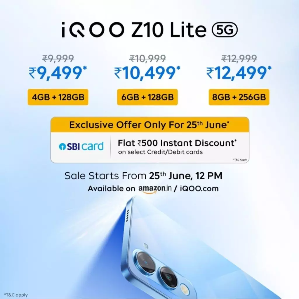 फोन की बिक्री 25 जून, दोपहर 12 बजे से Amazon.in और iQOO की आधिकारिक वेबसाइट पर शुरू होगी। लॉन्च ऑफर के तहत SBI कार्ड धारकों को ₹500 का इंस्टेंट डिस्काउंट भी मिलेगा।