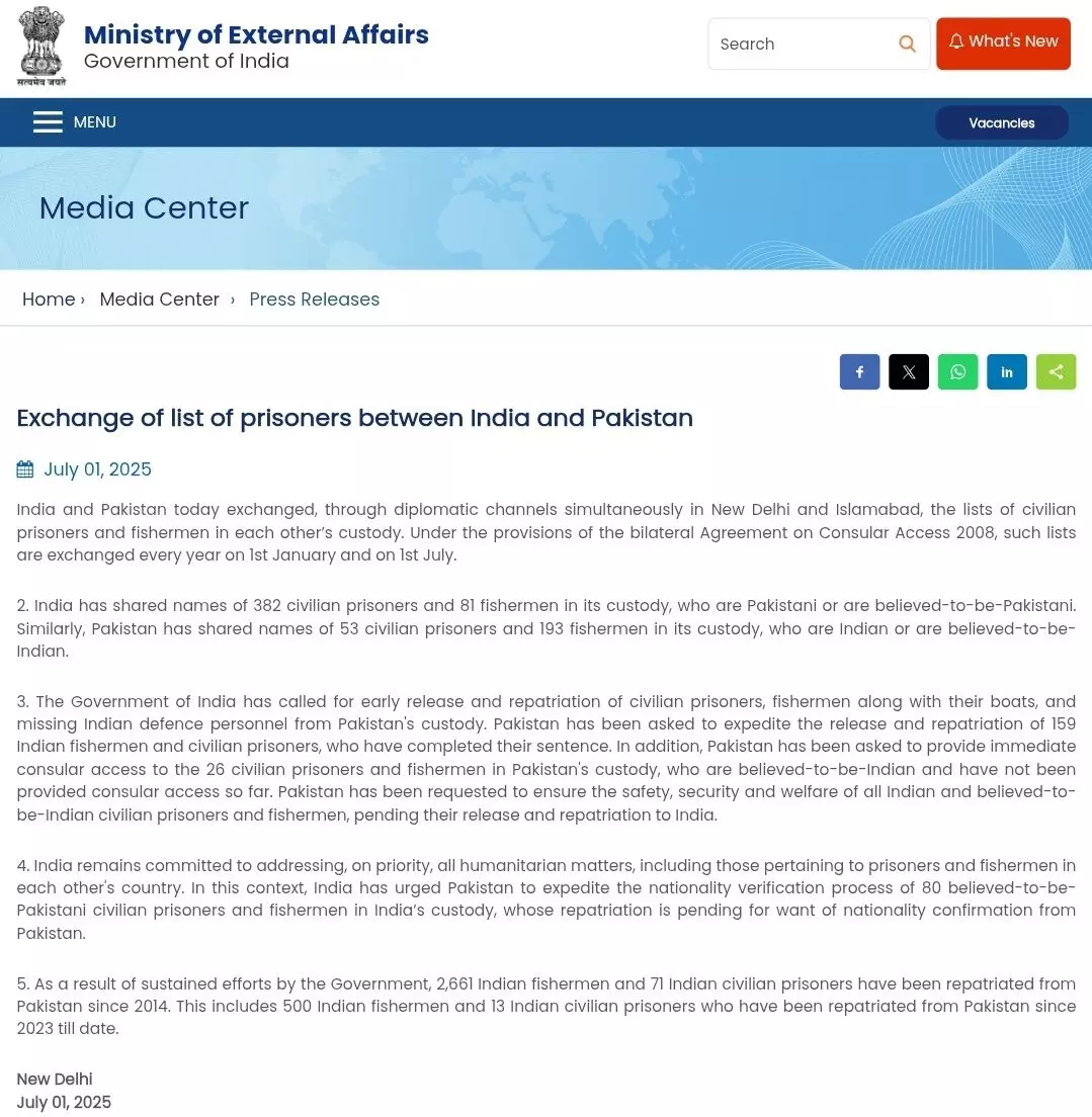 India-Pakistan Exchange Prisoner: भारत और पाकिस्तान ने 1 जुलाई 2025 को राजनयिक चैनलों के जरिए एक-दूसरे की हिरासत में मौजूद नागरिक कैदियों और मछुआरों की सूची का आदान-प्रदान किया। यह प्रक्रिया 2008 के कांसुलर एक्सेस समझौते के तहत हर साल 1 जनवरी और 1 जुलाई को की जाती है। भारत ने पाकिस्तान को 382 कैदियों और 81 मछुआरों की सूची सौंपी, जिन्हें पाकिस्तानी नागरिक माना जाता है। वहीं, पाकिस्तान ने भारत को 53 कैदियों और 193 मछुआरों की सूची दी, जिन्हें भारतीय नागरिक माना गया है।