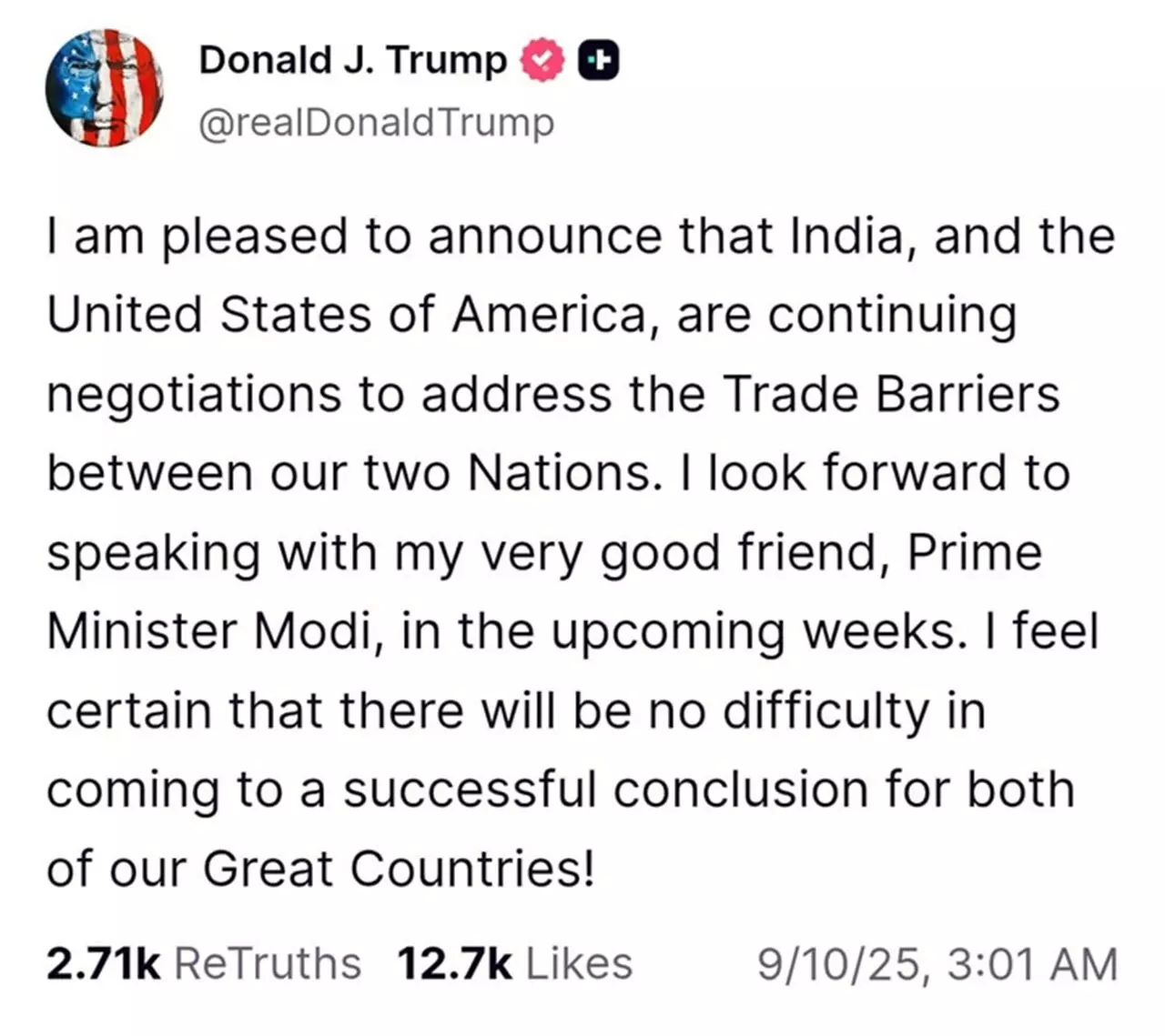 “India और United States of America के बीच ट्रेड बैरियर्स को दूर करने के लिए बातचीत जारी है। मैं अपने बहुत अच्छे दोस्त प्रधानमंत्री मोदी से आने वाले हफ्तों में बातचीत करने के लिए उत्सुक हूं। मुझे विश्वास है कि दोनों महान देशों के लिए एक सफल निष्कर्ष तक पहुंचना मुश्किल नहीं होगा।”