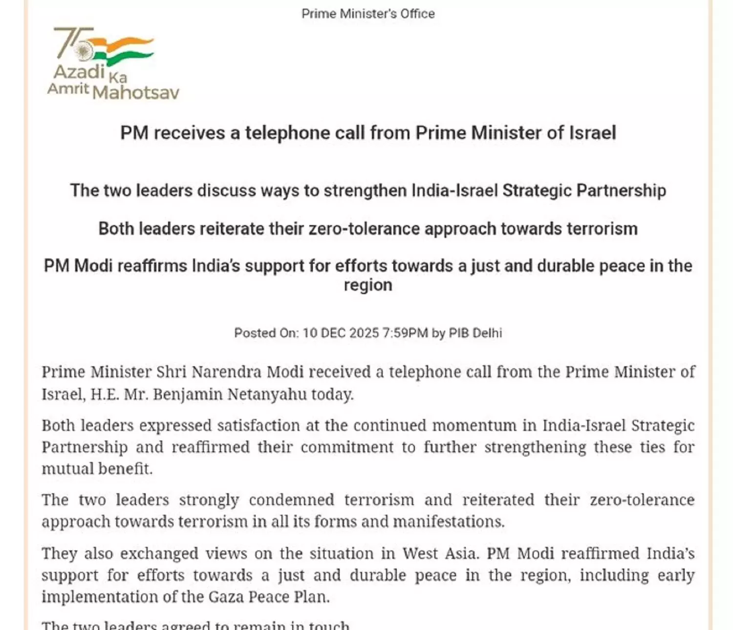 इस फोन कॉल से एक बार फिर साफ हो गया कि मौजूदा क्षेत्रीय संकट के बीच भारत और ट्रंप की शांति पहल के बाद भी भारत और इजराइल अपनी रणनीतिक साझेदारी को और मजबूत करने के लिए पूरी तरह प्रतिबद्ध हैं।