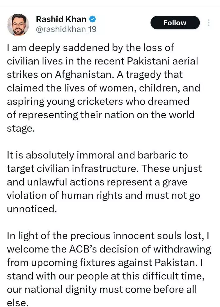उन्होंने आगे कहा, “इन निर्दोष जिंदगियों की क्षति को देखते हुए, मैं अफगानिस्तान क्रिकेट बोर्ड (ACB) के उस फैसले का पूर्ण समर्थन करता हूं, जिसमें पाकिस्तान के खिलाफ आगामी मैचों से हटने का निर्णय लिया गया है। इस कठिन घड़ी में मैं अपने देशवासियों के साथ हूं और हमारी राष्ट्रीय अस्मिता और गरिमा को सबसे ऊपर रखना आवश्यक है।”