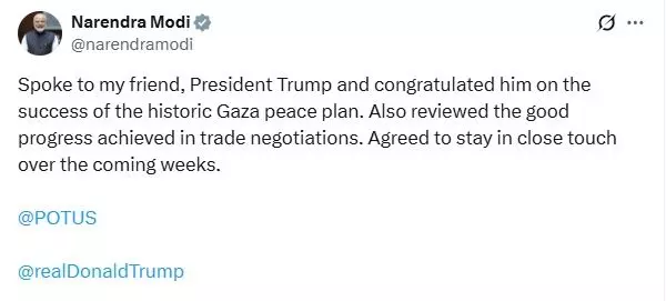पीएम मोदी ने एक्स (पूर्व ट्विटर) पर पोस्ट करते हुए लिखा, “मेरे मित्र राष्ट्रपति ट्रंप से बात की और गाजा शांति योजना की सफलता पर बधाई दी। साथ ही द्विपक्षीय व्यापार वार्ताओं में हुई अच्छी प्रगति की समीक्षा की। आने वाले हफ्तों में करीबी संपर्क बनाए रखने पर सहमति बनी।”