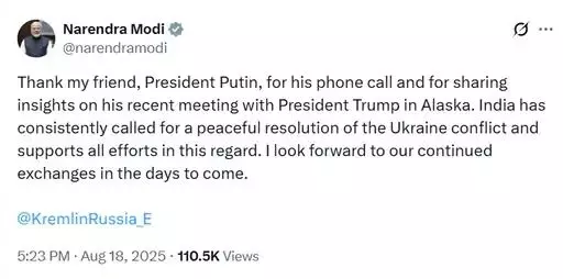 प्रधानमंत्री मोदी ने राष्ट्रपति पुतिन का आभार व्यक्त करते हुए एक्स (ट्विटर) पर लिखा, ''मैं अपने मित्र राष्ट्रपति पुतिन को उनके फोन कॉल के लिए और अलास्का में राष्ट्रपति ट्रम्प के साथ उनकी हालिया बैठक के बारे में जानकारी साझा करने के लिए धन्यवाद देता हूं। भारत ने यूक्रेन विवाद के शांतिपूर्ण समाधान का लगातार आह्वान किया है और इस संबंध में सभी प्रयासों का समर्थन करता है। मैं आने वाले दिनों में हमारे निरंतर आदान-प्रदान की आशा करता हूं।''