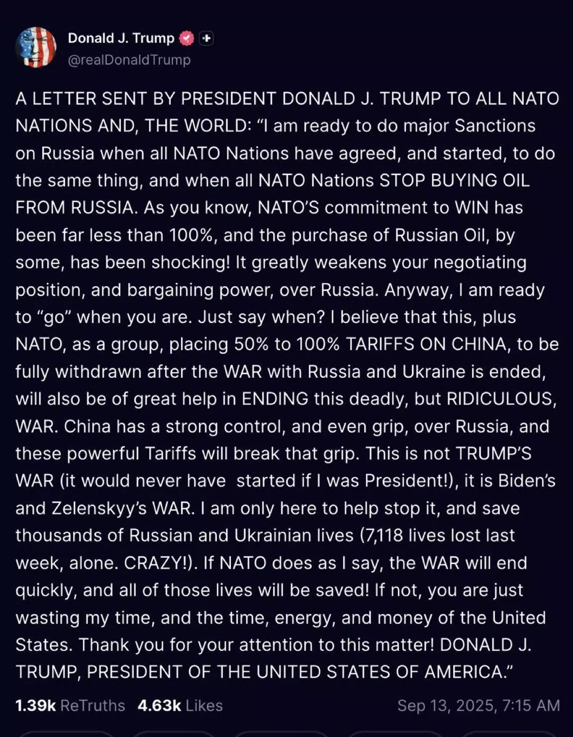 शनिवार को जारी एक पत्र में ट्रंप ने नाटो सदस्य देशों से रूसी तेल की खरीद बंद करने और रूस पर कड़े प्रतिबंध लगाने की भी मांग की।