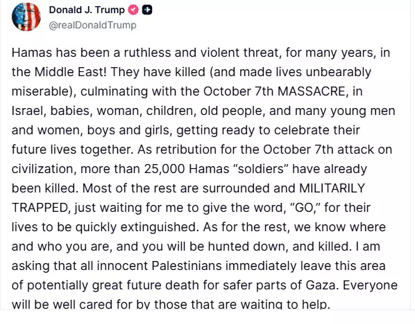 ट्रंप ने अपने सोशल मीडिया प्लेटफॉर्म ट्रुथ सोशल पर लिखा,"हम मध्य पूर्व में किसी भी हाल में शांति स्थापित करेंगे। हिंसा और खून-खराबा अब रुकेगा। सभी बंधकों को तुरंत रिहा करो, जिनमें मृतकों के शव भी शामिल हैं। यह हमास के लिए अंतिम अवसर है।"